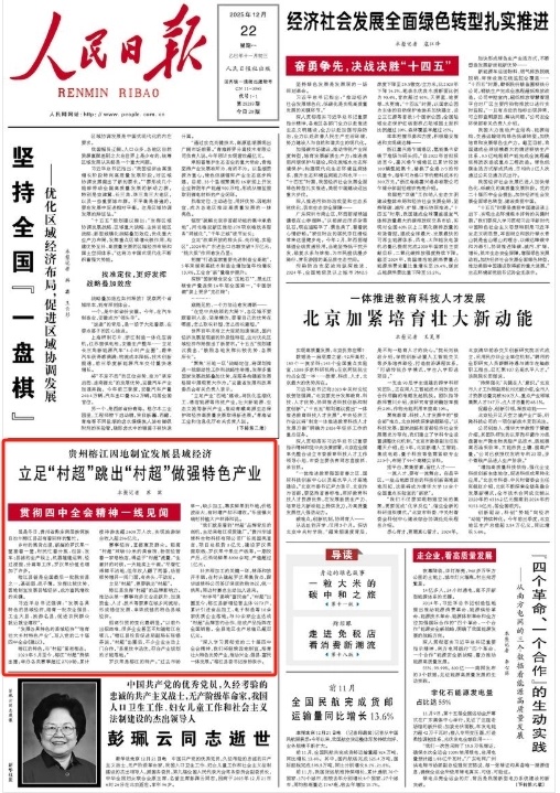 12月22日,《人民日报》头版刊发文章《贵州榕江因地制宜发展县域经济 立足“村超”跳出“村超”做强特色产业》,关注榕江县发挥“村超”的品牌影响力,推动从单一赛事向多元业态跃升,加速资金、人才、技术等要素在城乡间流动,形成错位发展、串珠成链的特色县域经济。具体报道如下: