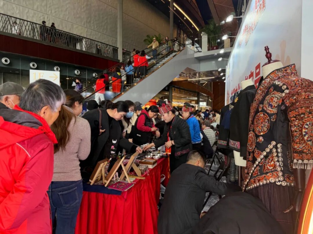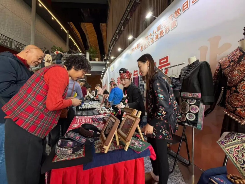 与此同时,惠民文化消费市集内人头攒动。苗族银饰、苗绣、蜡染等非遗手工艺品琳琅满目,巧夺天工的工艺让观众赞叹不已;“村BA”系列文创产品创意十足,将赛事活力与民族元素巧妙融合。特别值得一提的是,台江县以国家大剧院“艺生活”logo为核心,融合龙、蝴蝶、花鸟等苗族传统纹样,采用苗绣“绘”制了《苗韵艺华章》,以此祝福国家大剧院建院十八周年;苗人匠心文化创意有限责任公司更联合国家大剧院,打造出涵盖5个品类20余款的系列文创产品,吸引众多首都观众争相选购,让大家在近距离观赏与体验中,感受台江非遗的传承魅力与文创产业的创新成果。
