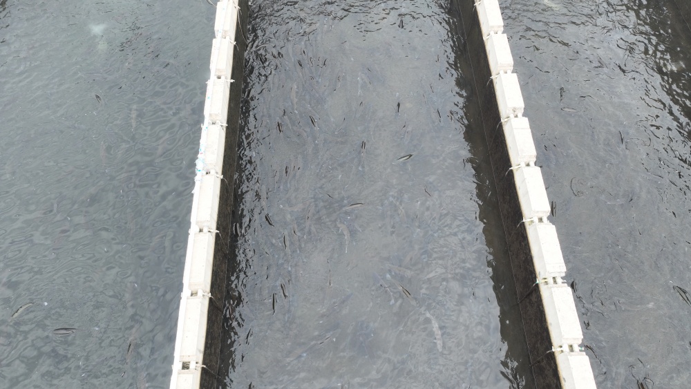 生态保护不仅带来了美景和珍禽,更转化为了实实在在的经济效益。在水库岸边,300多米长的巨型养殖区里,38个20米长、4米宽的小鱼池如“翡翠田畦”整齐排列。清澈见底的水池里,生态活水从水库深处源源涌入,成群的虹鳟三文鱼身形矫健,自在游弋,尽显活力。