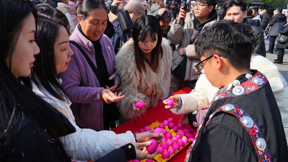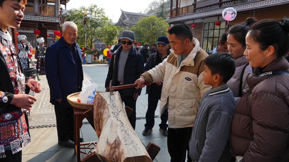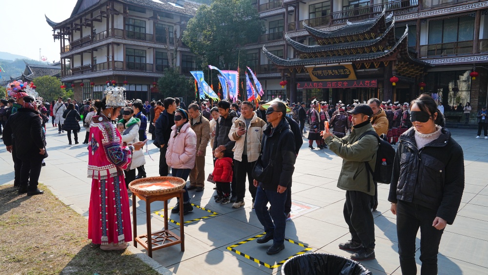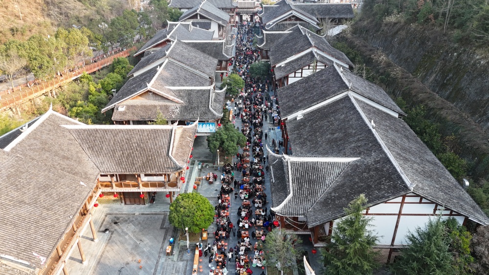 NPC互动体验活动欢声与笑语交织,套鸭子、敲钉子、投壶、竹竿舞等趣味项目接连上演。千人刨汤宴,游客与当地村民齐聚一堂,品尝剑河地道的过年刨汤饭,敬酒歌、猜拳等互动,让游客深度体验了小镇当地浓厚的民俗。夜幕降临,篝火晚会将活动推向高潮,木鼓舞、芦笙舞、“村T”走秀等表演轮番登场,最后共同放飞祈福灯,在温馨氛围中为当日活动画上句点。