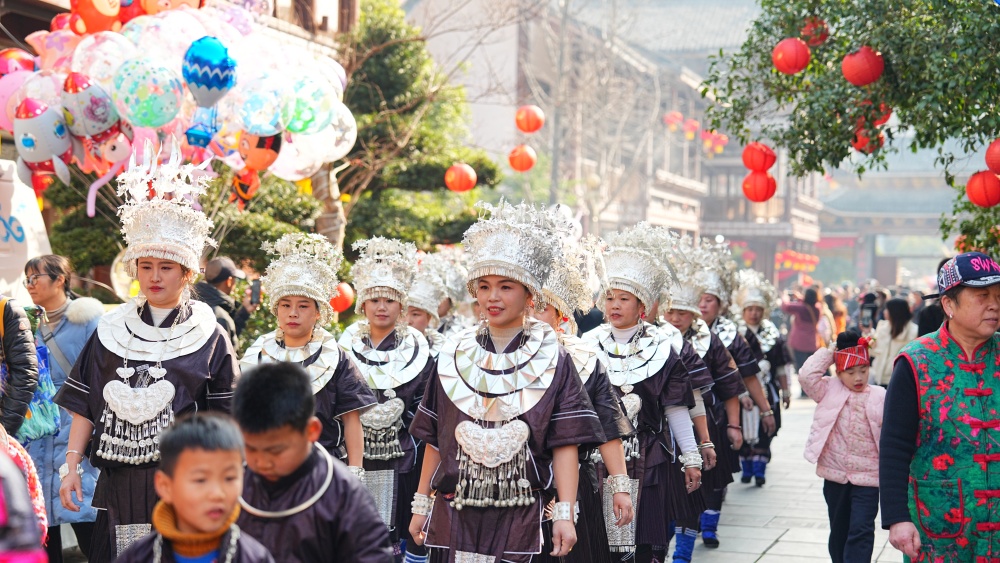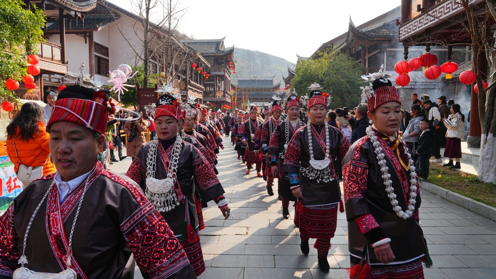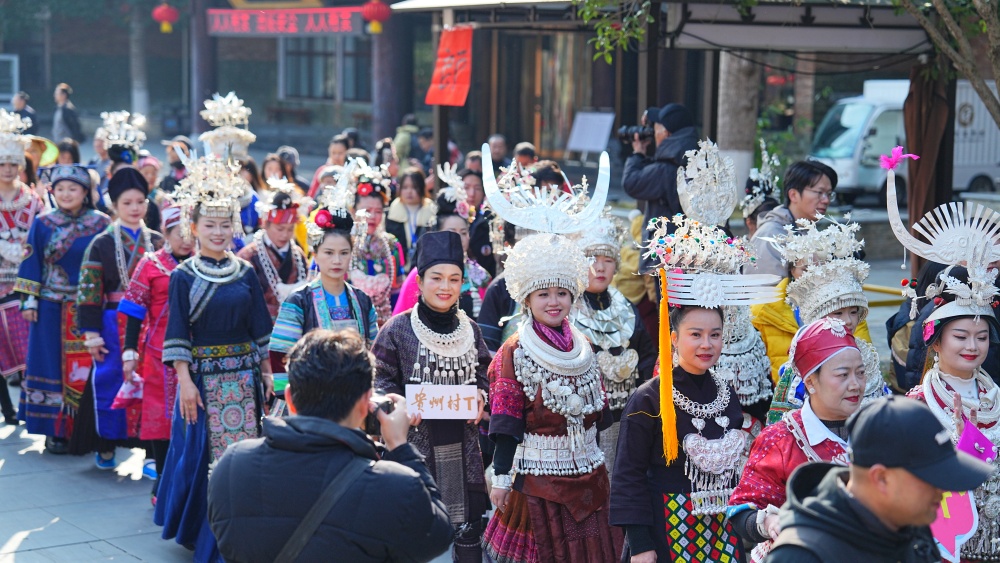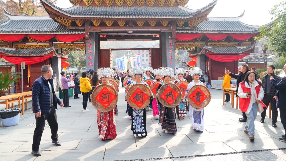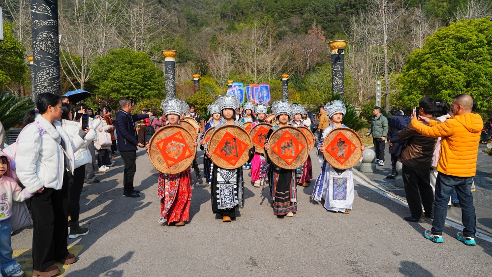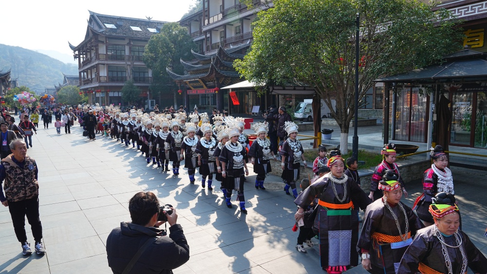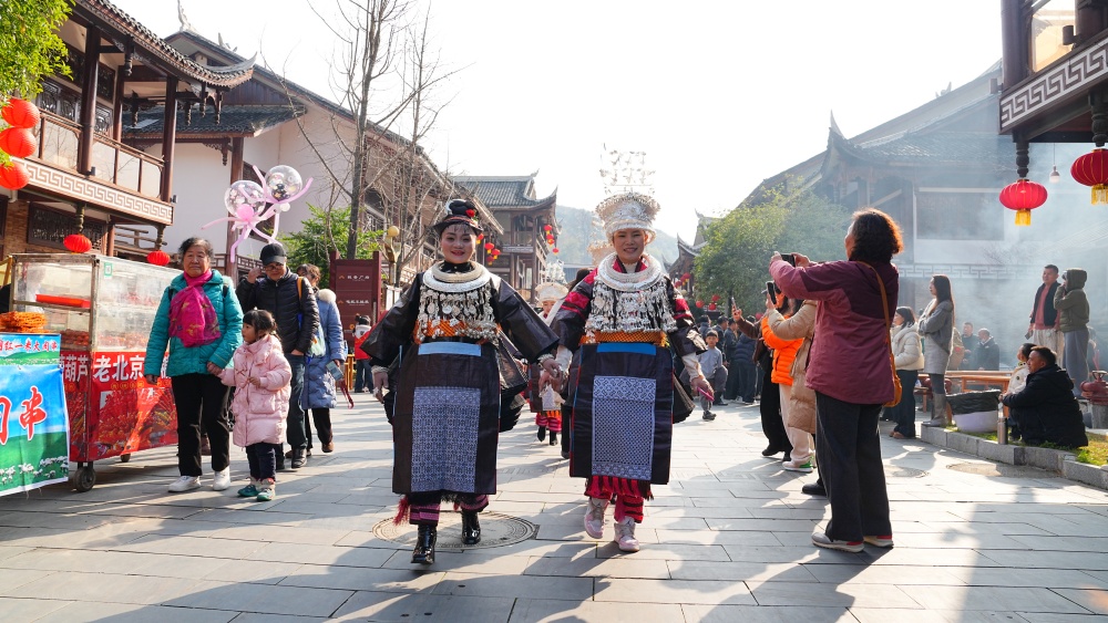 活动现场暖意融融、热闹非凡。上午10时许,温泉小镇大门处的拦门迎宾仪式率先开启系列活动的帷幕。由当地村民组成的民族风情巡游队伍沿着景区的道路,踏着舞步款款行进,红绣、锡绣、短裙等特色民族服饰依次亮相,银饰叮当声与芦笙乐曲交织回荡。“贵州村T”表演队伍的加入更添亮点,展示了贵州各地少数民族服饰的多样风采,成为流动的民族文化画卷。
