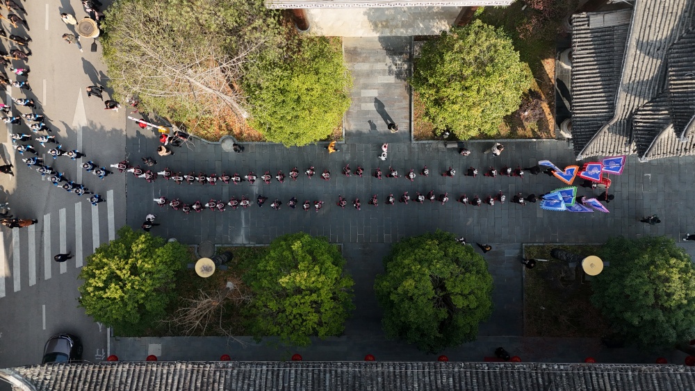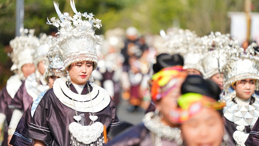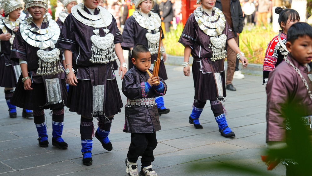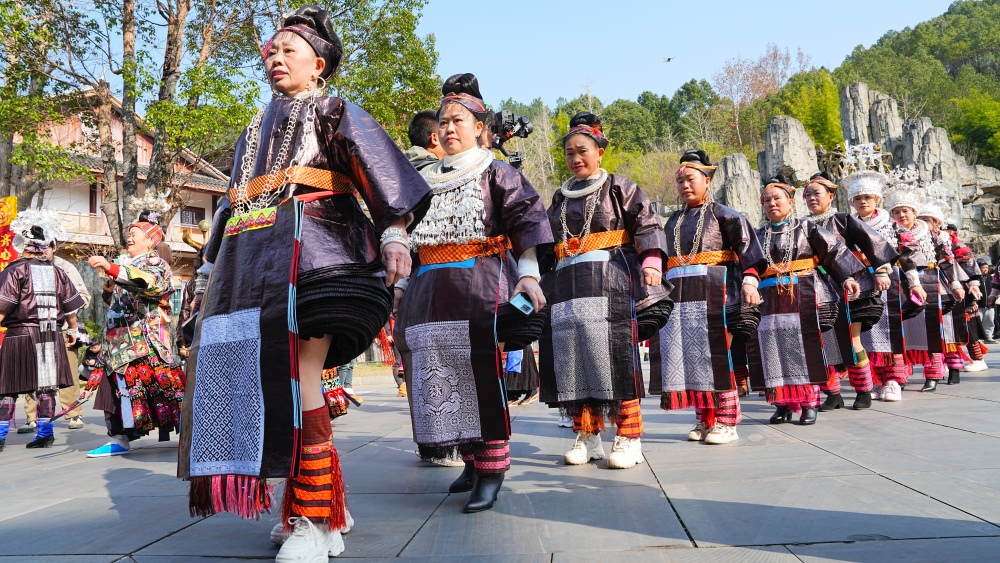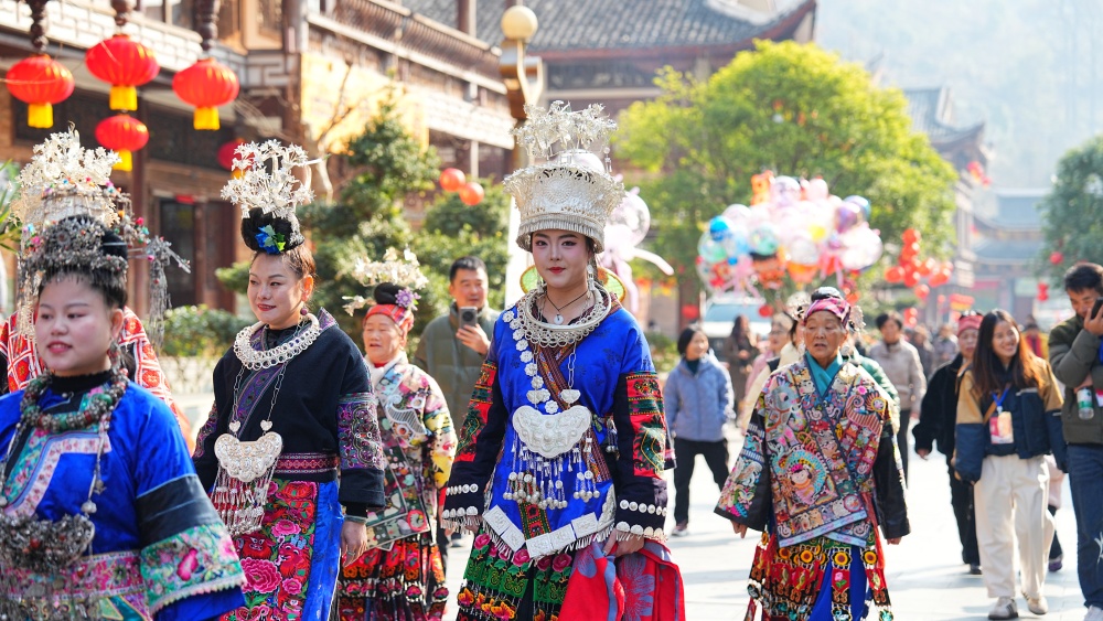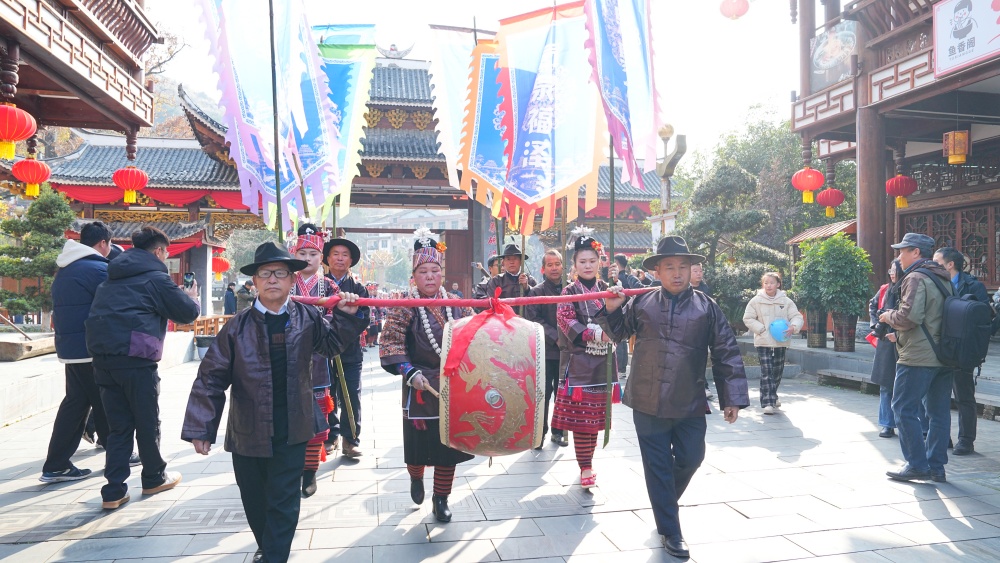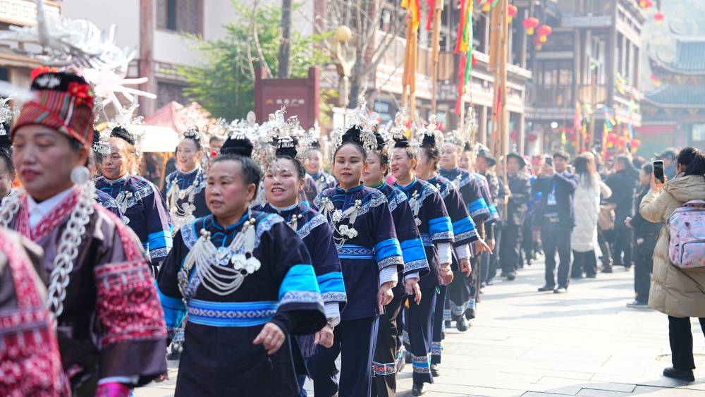 活动现场暖意融融、热闹非凡。上午10时许,温泉小镇大门处的拦门迎宾仪式率先开启系列活动的帷幕。由当地村民组成的民族风情巡游队伍沿着景区的道路,踏着舞步款款行进,红绣、锡绣、短裙等特色民族服饰依次亮相,银饰叮当声与芦笙乐曲交织回荡。“贵州村T”表演队伍的加入更添亮点,展示了贵州各地少数民族服饰的多样风采,成为流动的民族文化画卷。