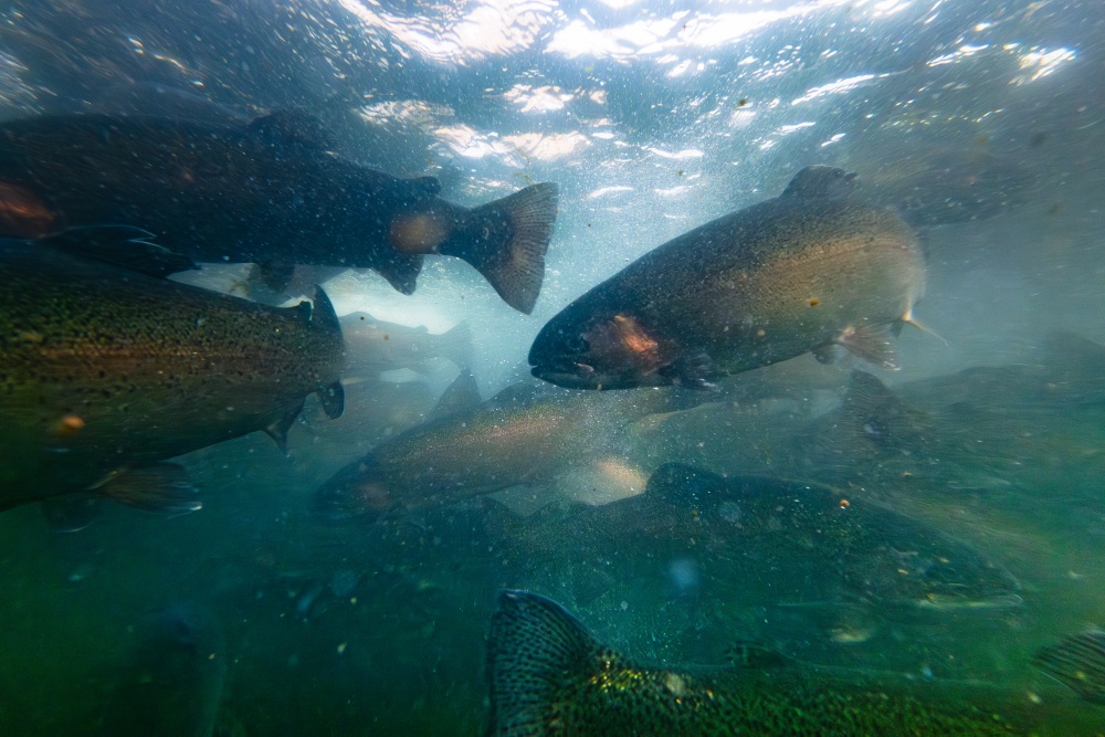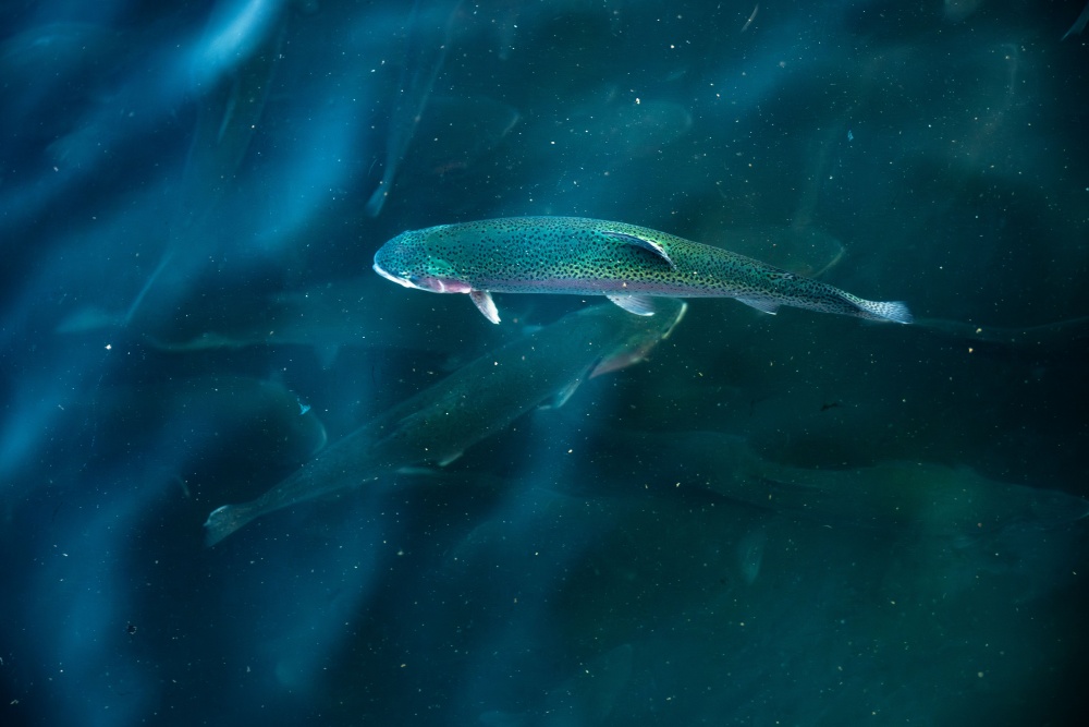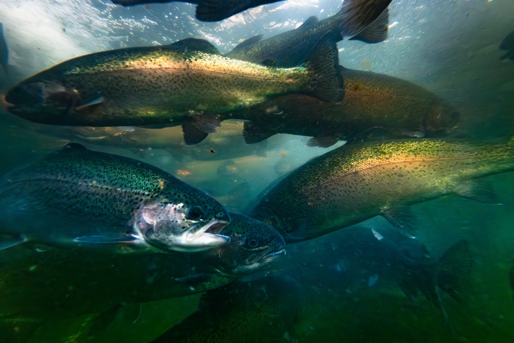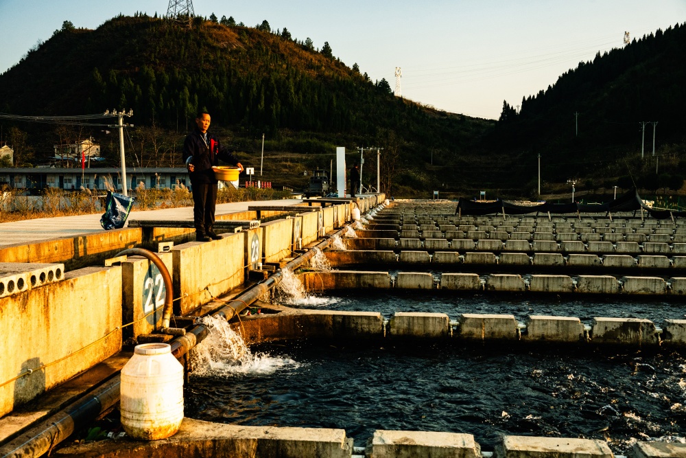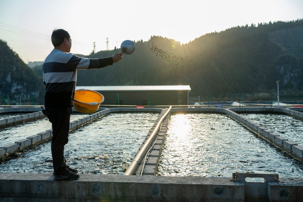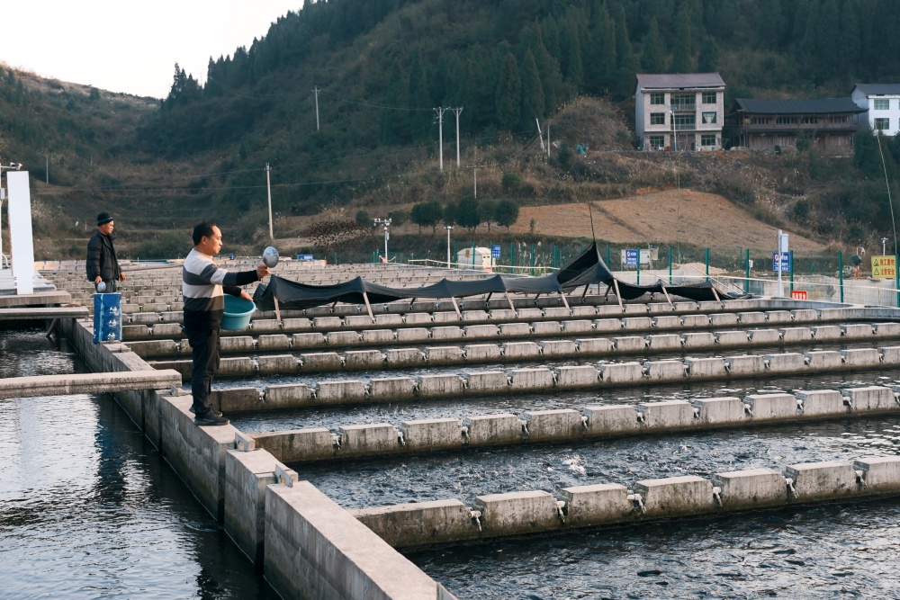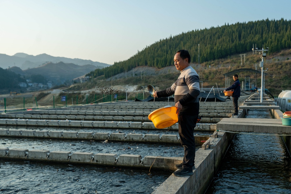 冬日暖阳下,岑巩县大有镇下溪水库波光粼粼,宛如镶嵌在群山间的蓝宝石。岸边养殖区里,38个整齐排列的鱼池如“翡翠田畦”,工人们正忙着投放饲料,成群虹鳟三文鱼在清澈水中矫健游弋,一派忙碌景象。