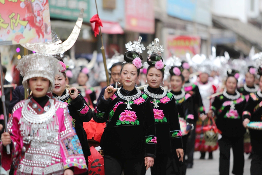 中午13时许,锣鼓声率先打破老街的宁静,巡游队伍化作一道流动的风景线正式启程。身着五彩民族服饰的表演者们,伴着欢快的乐曲载歌载舞,银饰叮当声与市民游客的欢笑声相互交织,队伍所到之处,皆是热闹与欢喜。围观群众纷纷驻足,用镜头定格精彩瞬间。