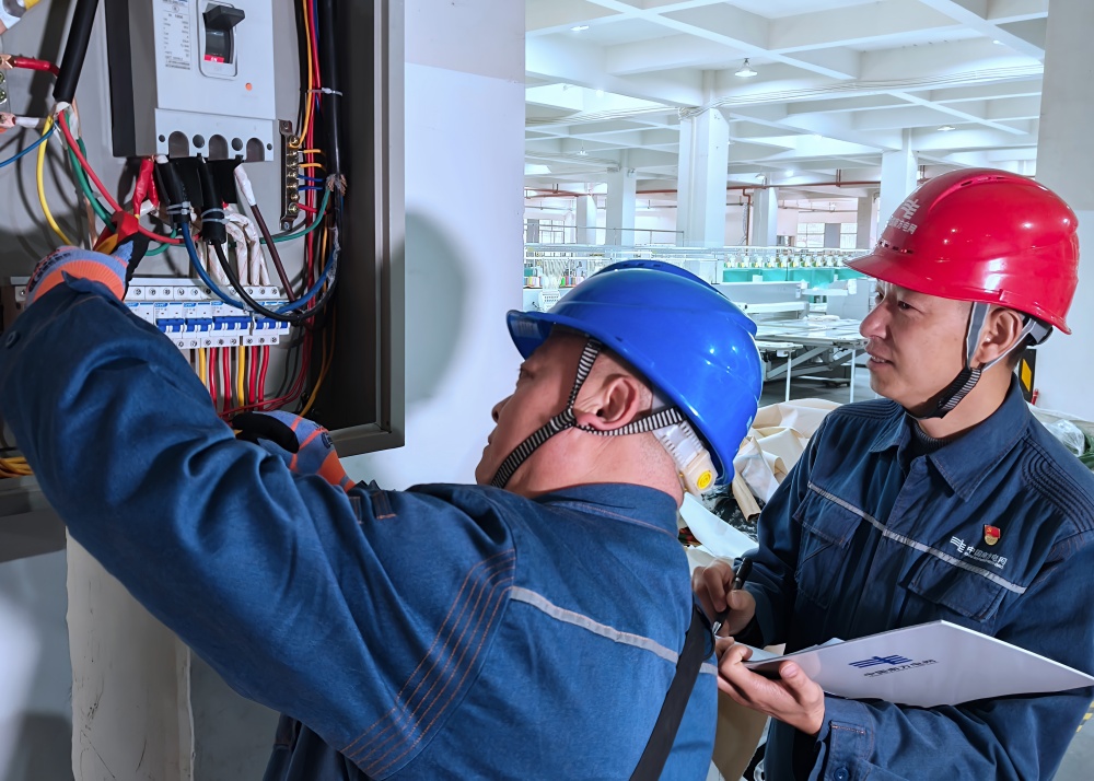 在苗绣工坊内,2名供电员从生产车间的设备运转工况,到绣娘工作间的照明稳定情况,逐一细致检查;他们深入了解工坊实际用电需求,全面排查线路与设备的安全隐患,全力保障工坊生产用电安全稳定。