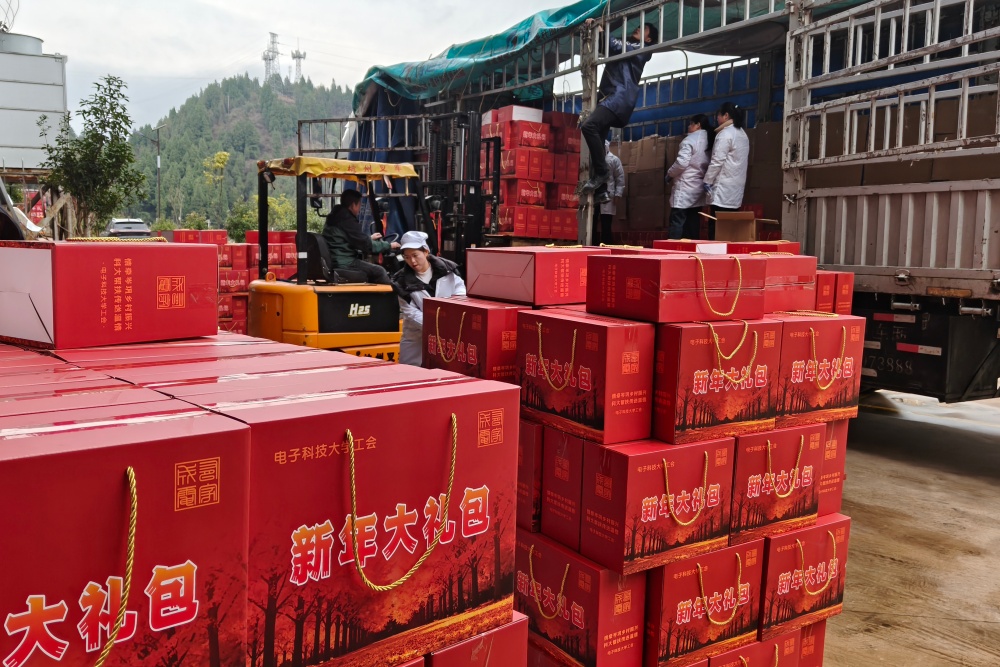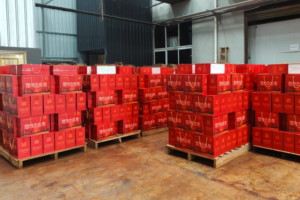 车间里,红色礼盒整齐码放如长龙,绿色包装的农特产品堆成小丘,搬运、分装的忙碌节奏中,尽显新春备货的“加速度”。礼包内品类丰富,不仅有岑巩本地特色果干、卜皮糖、豆干,还整合了铜仁木瓜银耳羹、辣条等州内优质农特产品,满足消费者多样化需求。