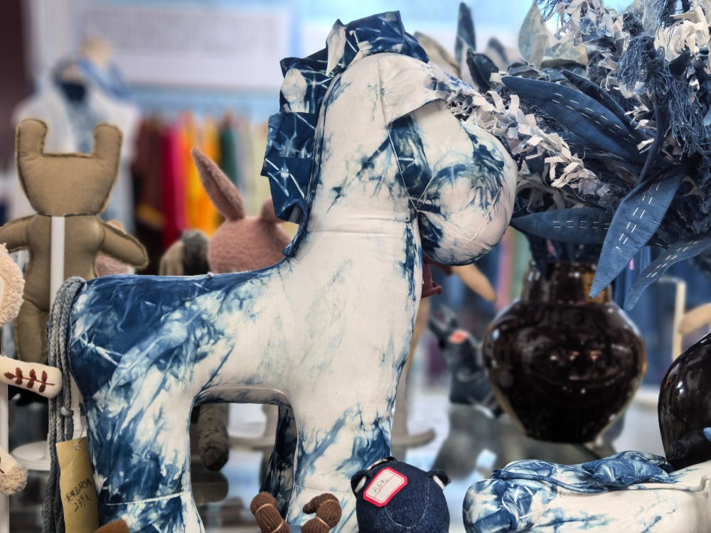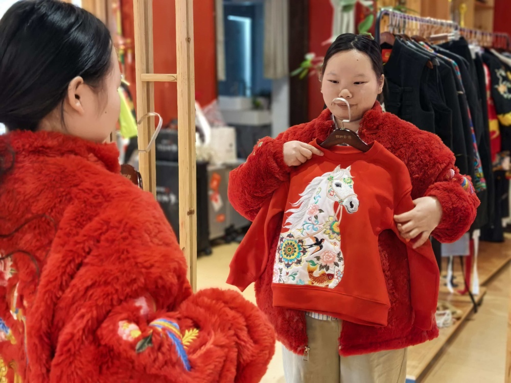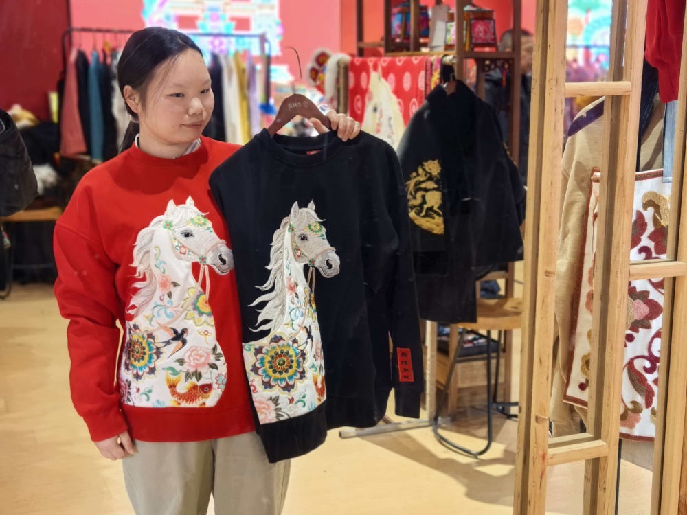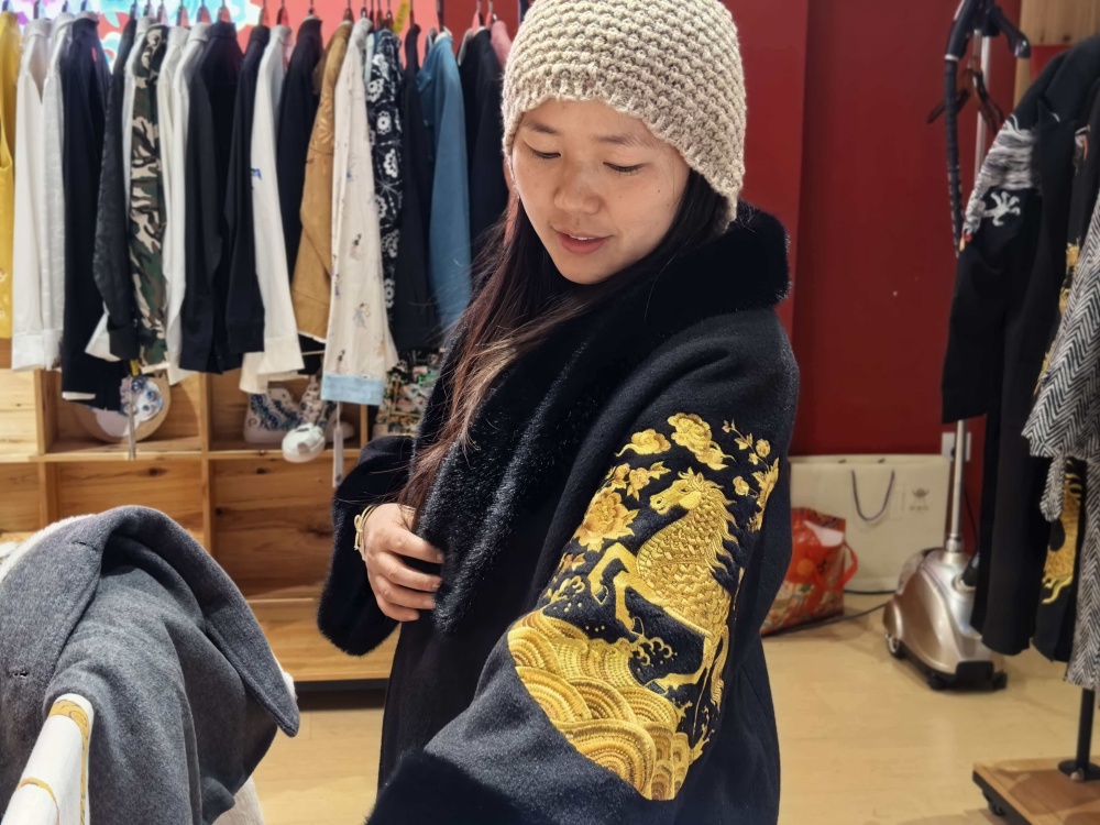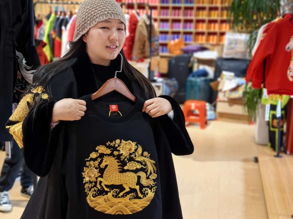 在古阿新中心门店,各类马年图案设计的衣服已全面上架,涵盖卫衣、大衣、浴巾、外套、裤子等多个品类,还有适合小朋友的卫衣。不少外地人因观看古阿新直播,专程来到实体店体验。这些产品凭借憨态可掬的造型、吉祥喜庆的寓意,一亮相便吸引了众多消费者的目光。其中,“马踏祥云”桌面摆件更是成为马年系列文创中的爆款。以马为原型设计的蜡染布艺小马文创,同样凭借可爱的造型和美好的寓意,成为消费者节日选购的热门之选。