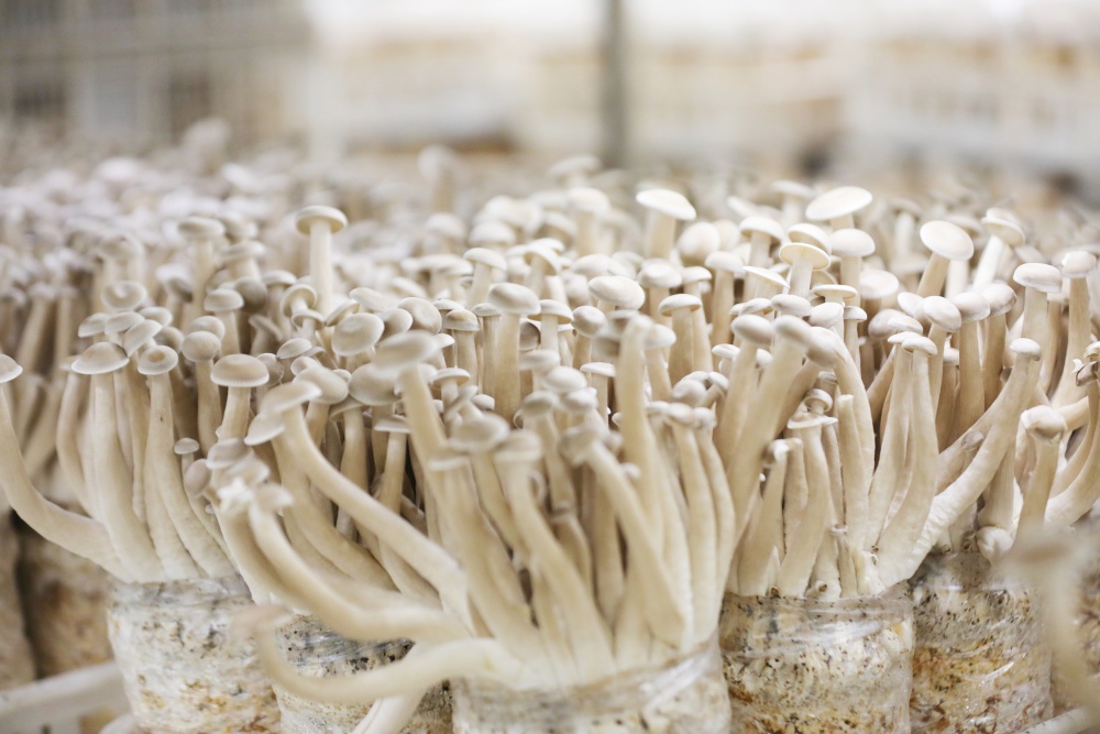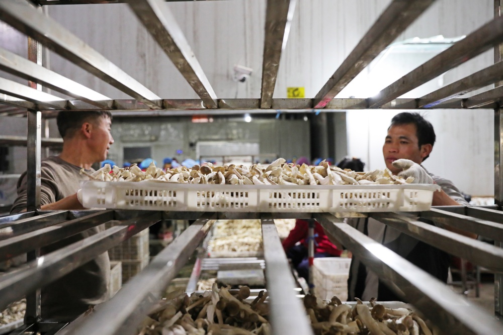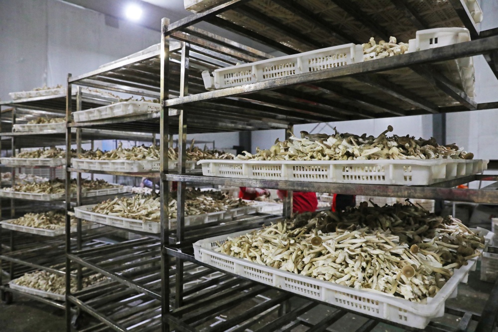 厂房里,制袋车间机械在高速运转,菌棒半成品沿传送带缓缓输出。相邻的出菇房内,菌菇饱满丰盈,工人正在加紧采收。采收后的菌包立即进入包装车间,经历切根、分离、分拣、称重与登记等环节后,继续运往下一个车间进行加工。工人们在自动化生产线旁娴熟地操作,从菌棒制作到鲜菇采收,各道工序都有条不紊。