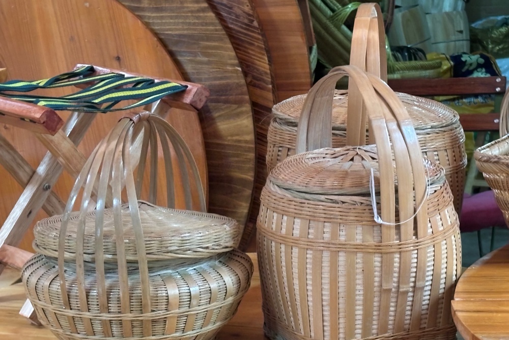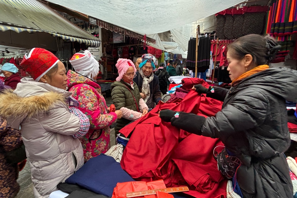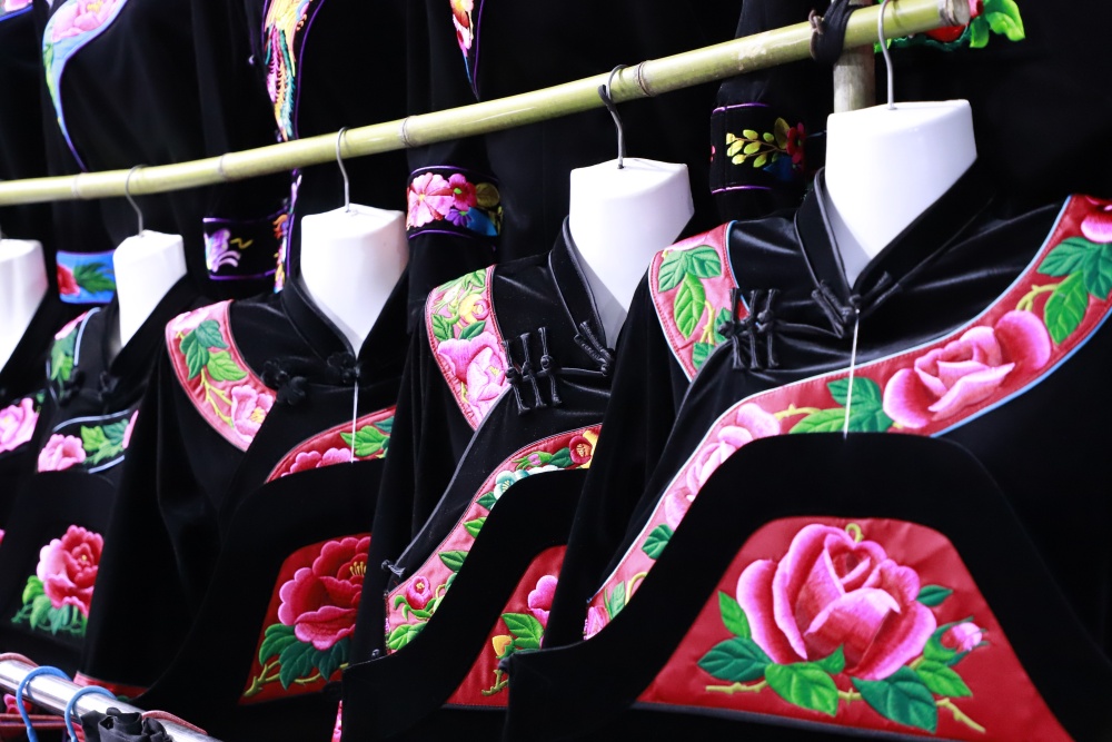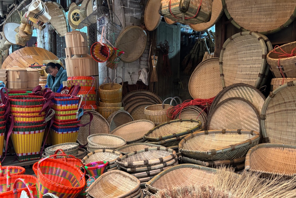 布料摊位前,苗族阿婆吴秀珍细细挑选着七彩丝线,摊主王妹在一旁热情推荐。小孙女朵朵攥着奶奶衣角,眼睛却早飘向了不远处的吃食摊。民族服饰街上,绣满蝶纹的苗装与艳丽绣片挂得满满当当;竹编巷里,手艺人十指翻飞,新编的竹篮还带着竹香。赶集的人走走停停,挑布料、选竹器、买小吃,很是热闹。
