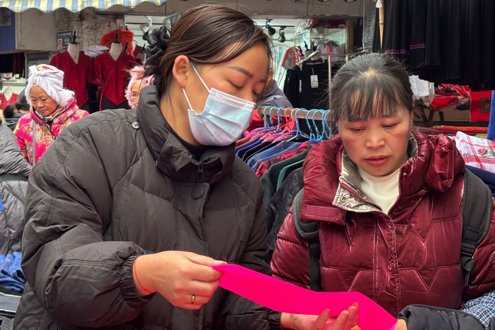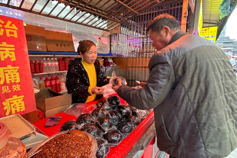“苗家布料,结实耐穿!”“手工竹编,好看好用!”吆喝声此起彼伏。吴秀珍为孙女选好了丝线和银饰,又买上热乎乎的糯米饭,竹篮里装得满满当当。“过年给娃娃做身新苗装,配上银饰,喜庆!”她笑着说。