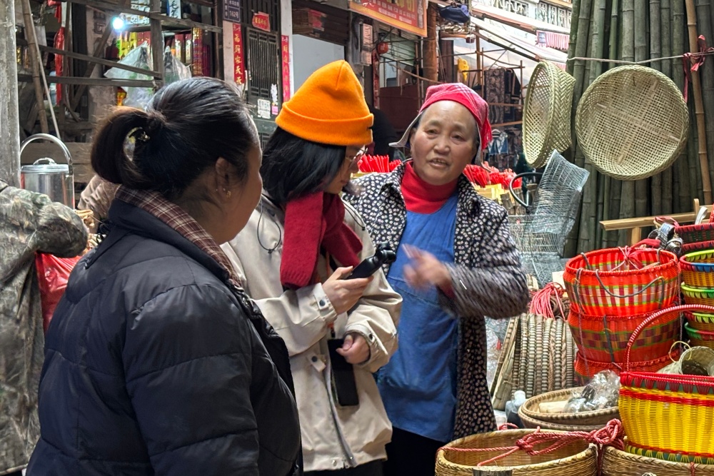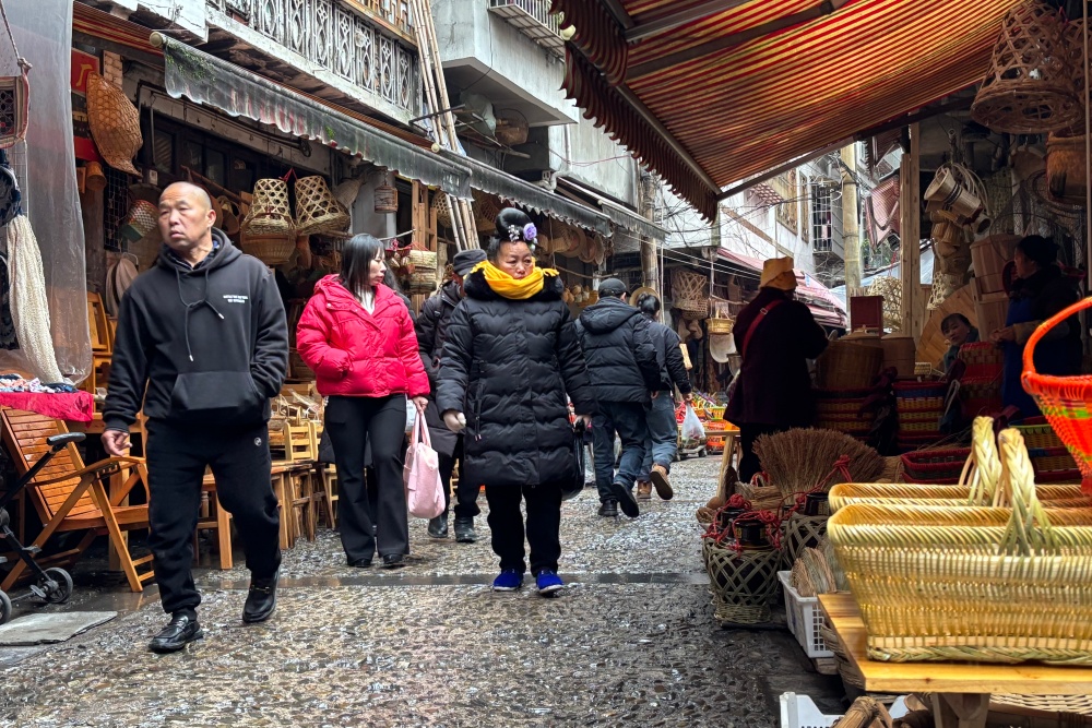 日头升高,晨雾散尽,老街热闹依旧。斑斓苗装与古朴竹编相映成趣,传统风情与市民欢笑交织,驱散了冬日的寒冷。