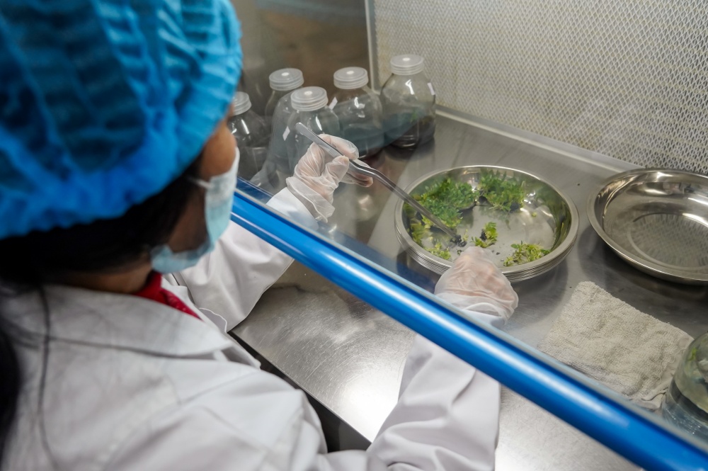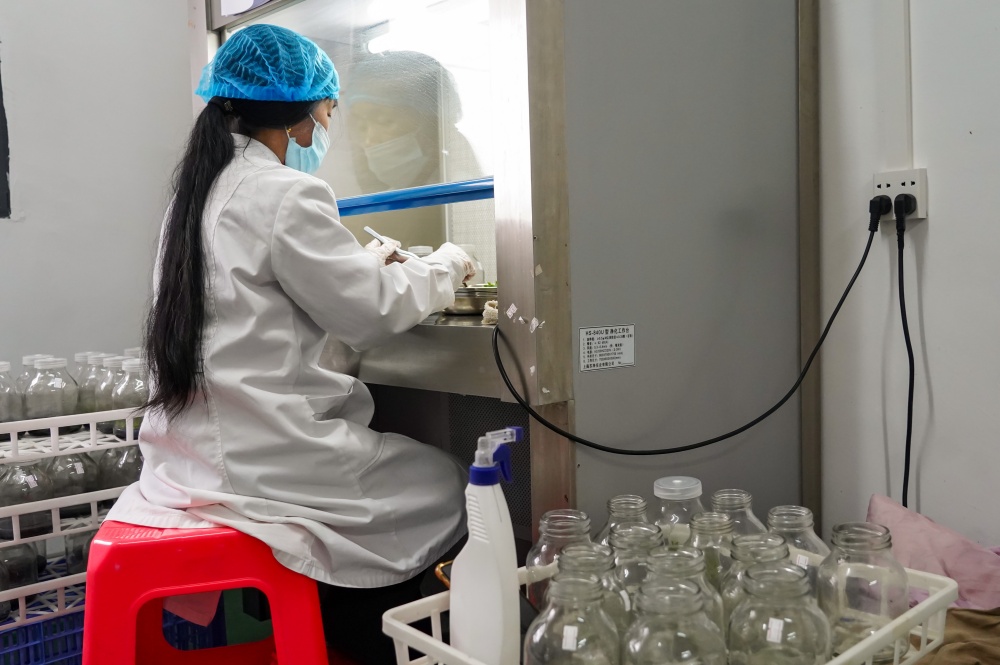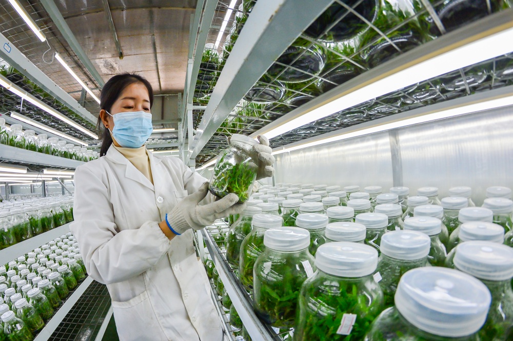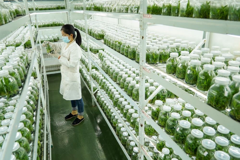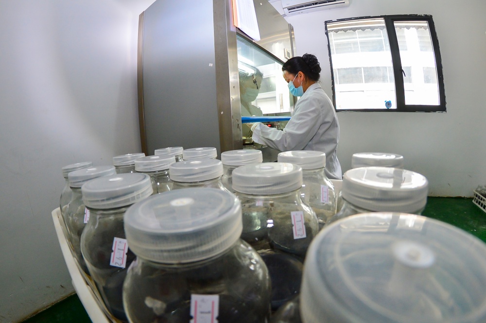 1月9日,工人在贵州省从江县贯洞镇铁皮石斛育苗基地的组培室里管护铁皮石斛苗。