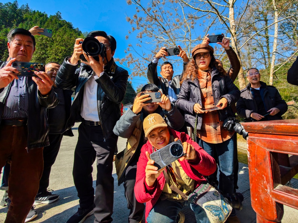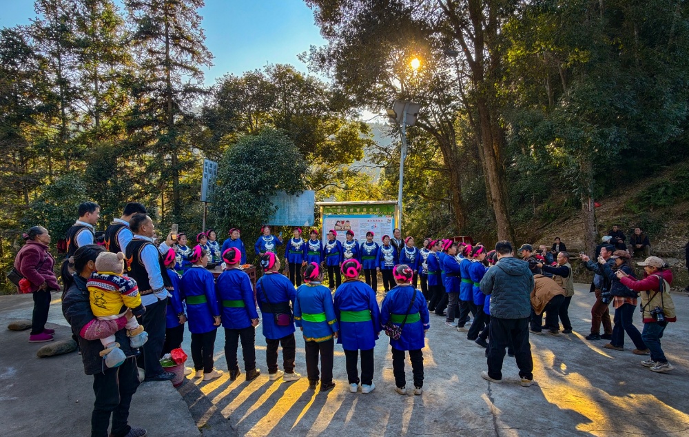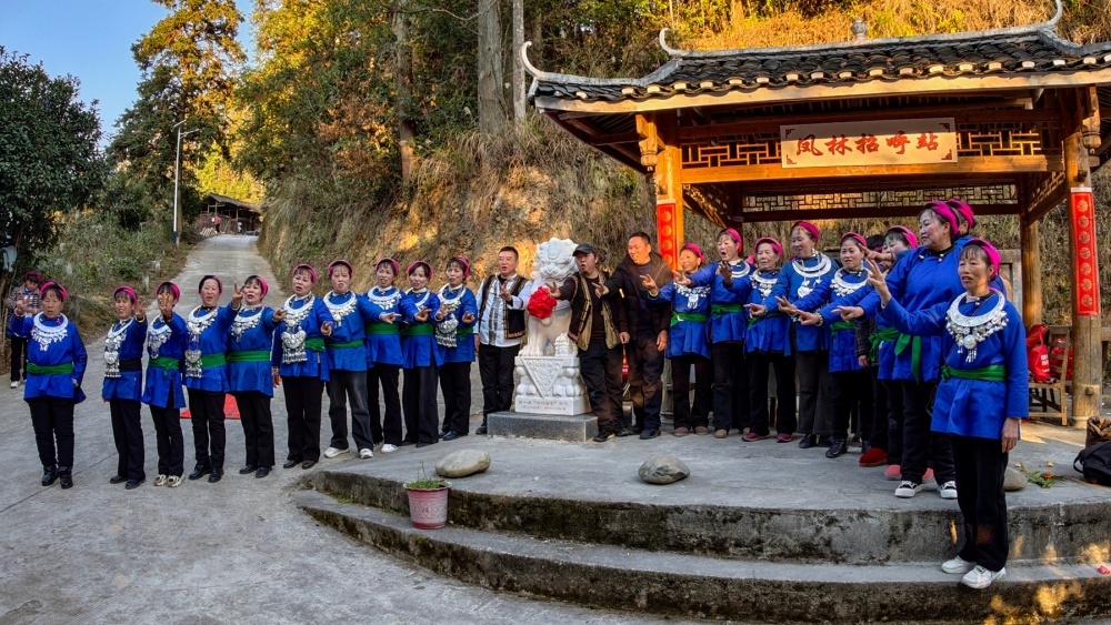 作为“四十八寨歌节”的核心传承地,山歌早已是凤林村人刻入骨髓的生活底色,更是新年里不可或缺的年味符号:田间地头练唱腔、院坝火塘赛山歌,村民们只需往院坝一站、在山林一立,原生态的嗓音便裹挟着对乡土的眷恋、对新春的期盼悠悠漫开。那清亮婉转的调子,时而如清水江潺潺流淌,时而如山间百灵欢唱,引得随行摄影师们快门不停。清脆的快门声与悠扬的歌声交织共鸣,成了村寨里最鲜活的新春节拍,也定格下北侗年味最本真的模样。