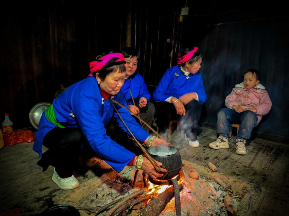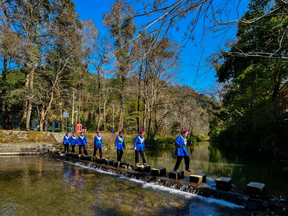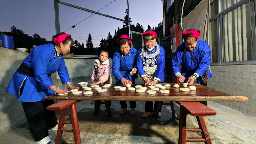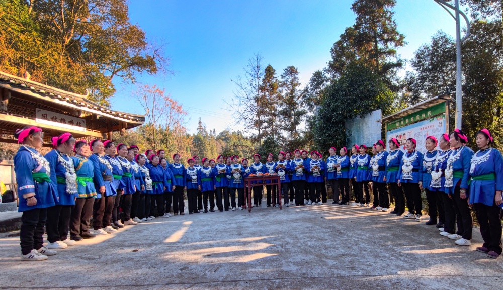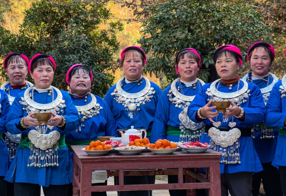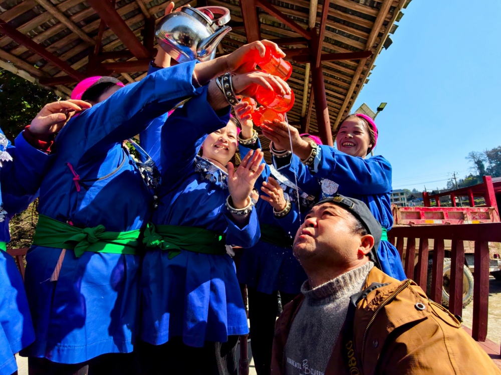 翻过几道山梁,凤林村层层叠叠的林木裹挟着葱郁绿意铺展蔓延,山林清风携着草木清芬与淡淡的年味漫过村寨。村口老枫树下,年味更是浓得化不开:身着蓝靛盛装、头裹玫红布帕的村民早早候在寨口,腰间银饰叮当作响,手中米酒碗满得险些溢香。“贵客到寨门,米酒敬亲人!”清亮的山歌顺着风势缠上访客的衣角,歌声未落,一碗碗热米酒已递至掌心。“侗歌一曲酒一杯”的热络氛围,瞬间将冬日寒意消融在酒香歌韵里,也把新年的热闹劲儿拉满。