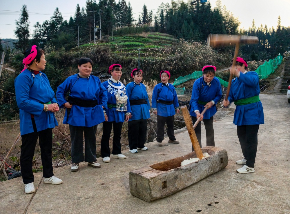 木臼旁的热闹场景,更是将年味推向高潮。热气腾腾的糯米刚倒进木臼,蒸腾的白雾便裹着清甜米香漫开,村民与来客挽起袖子,轮番握起木槌奋力捶打,“咚咚锵、咚咚锵”的撞击声与此起彼伏的欢笑声在山间久久回荡,惊起几只麻雀,也唤醒了村寨的新春。松散的米团渐渐变得黏糯弹牙,刚捶好的糍粑裹上细腻的黄豆粉,切下小块咬入口中,软糯香甜的滋味瞬间裹满舌尖;再配上一碗热气腾腾的鼎罐饭,恰是“丰年留客足鸡豚”的农家温情。这是侗族村寨最地道的年味,更是刻在游子心中最深的乡愁。