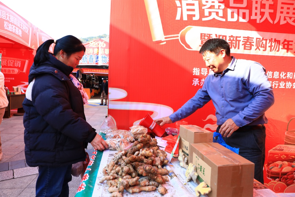 活动现场暖意融融,各类展位鳞次栉比,热闹非凡。作为本次活动的核心亮点,县内农特产品展区备受市民青睐,南加镇新柳村生姜、南明镇菜籽油、南明镇永兴村蜂蜜、太拥镇八万山黄精酒等特色产品集中亮相,凭借地道品质吸引了大批市民驻足挑选、争相购买。“我刚逛了一圈,这里的东西种类特别多,特意买了土蜂蜜和生姜,都是本地的好东西,过年炖肉、日常泡水都合适。”正在采购的市民秦女士笑着说道。贵州亚锋中药材种植科技有限公司负责人陈天平也表示:“今天刚开始,一上午就卖了20多瓶黄精酒,人流量和销量都超出了预期,特别满意。”