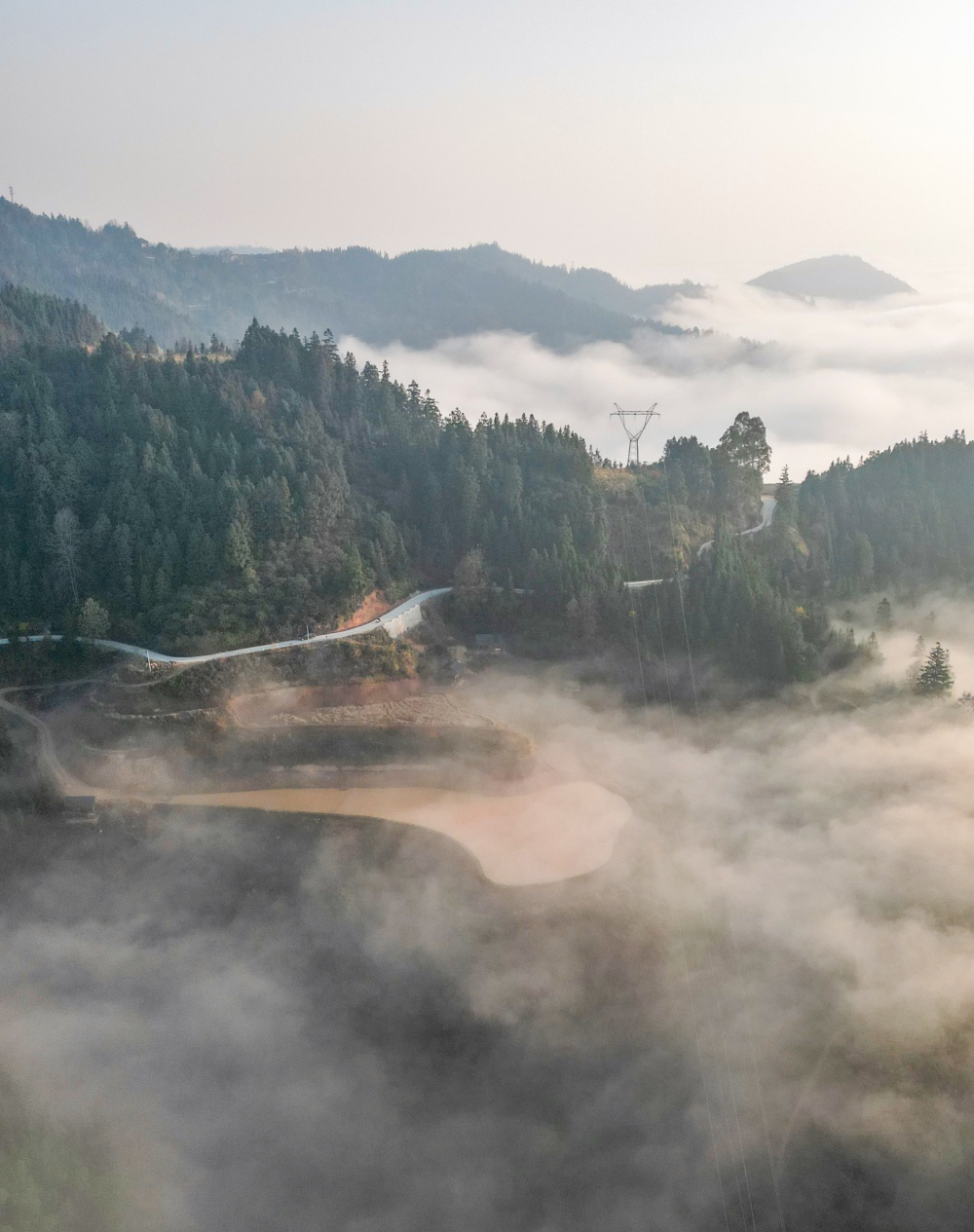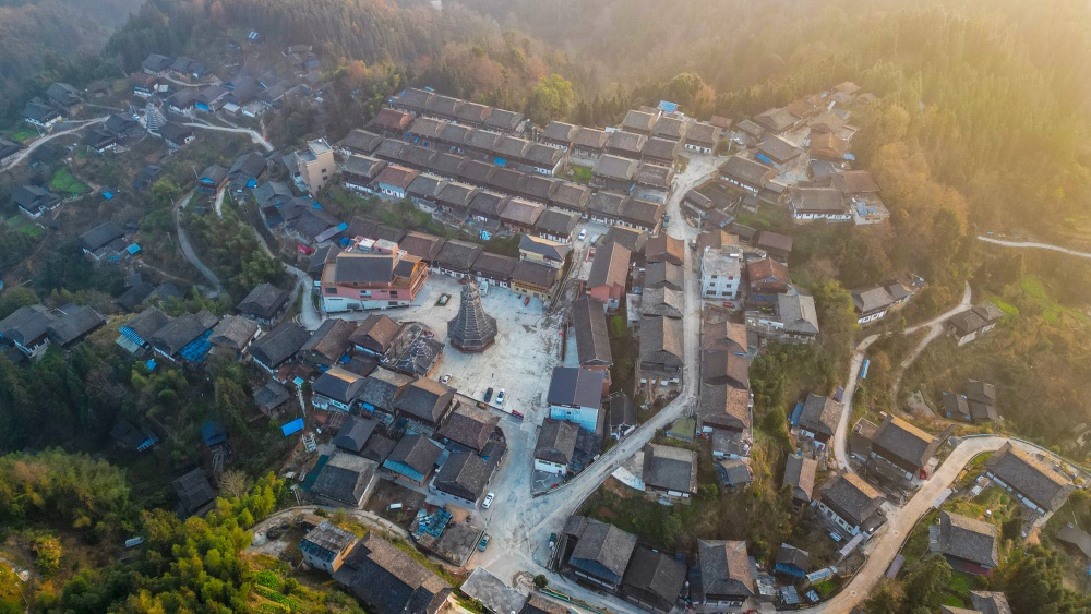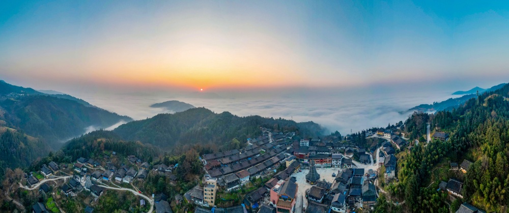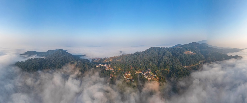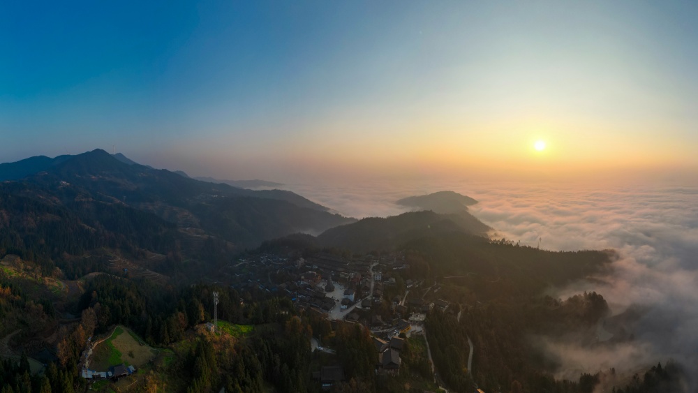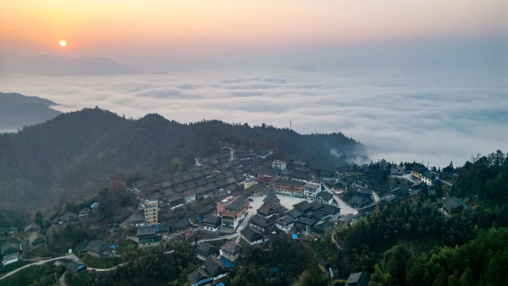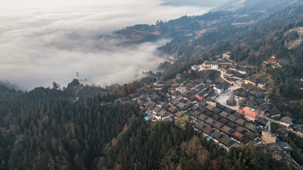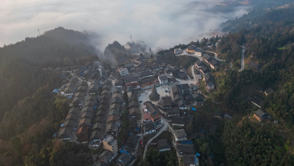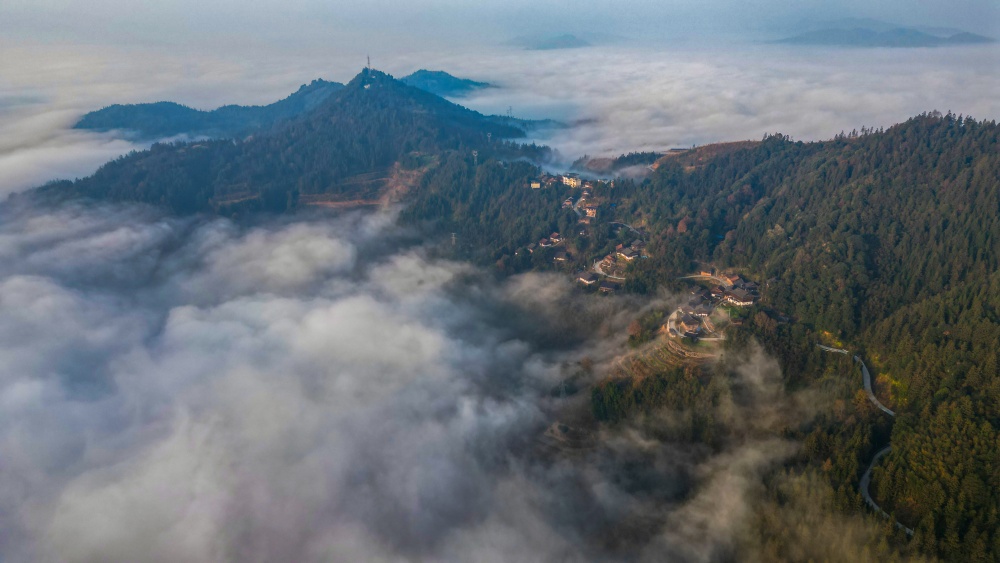 1月14日,贵州省从江县高增乡新生村云雾缭绕,群山、民居与公路在晨霭中若隐若现,宛如一幅静谧诗意的冬日乡村画卷。