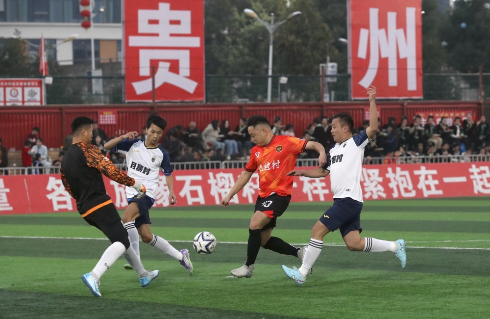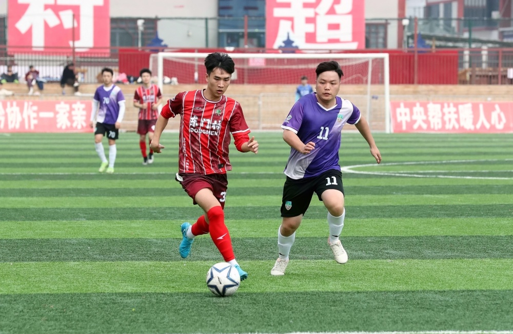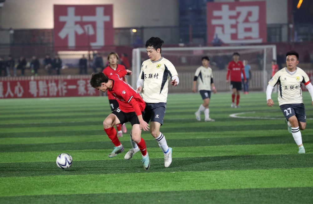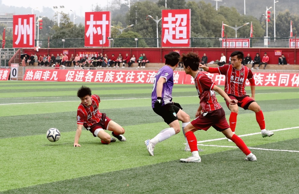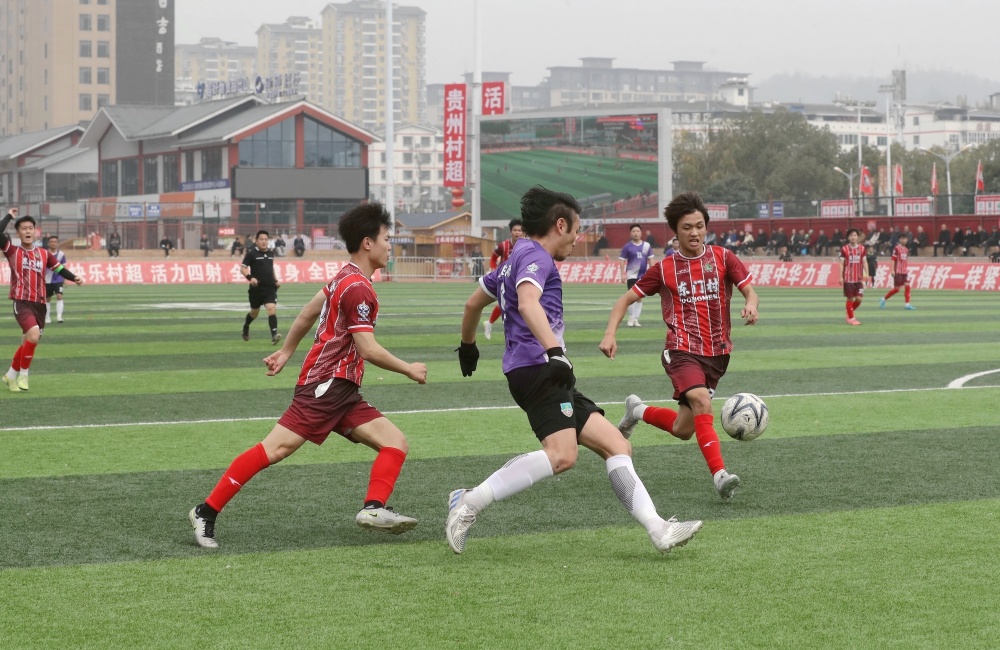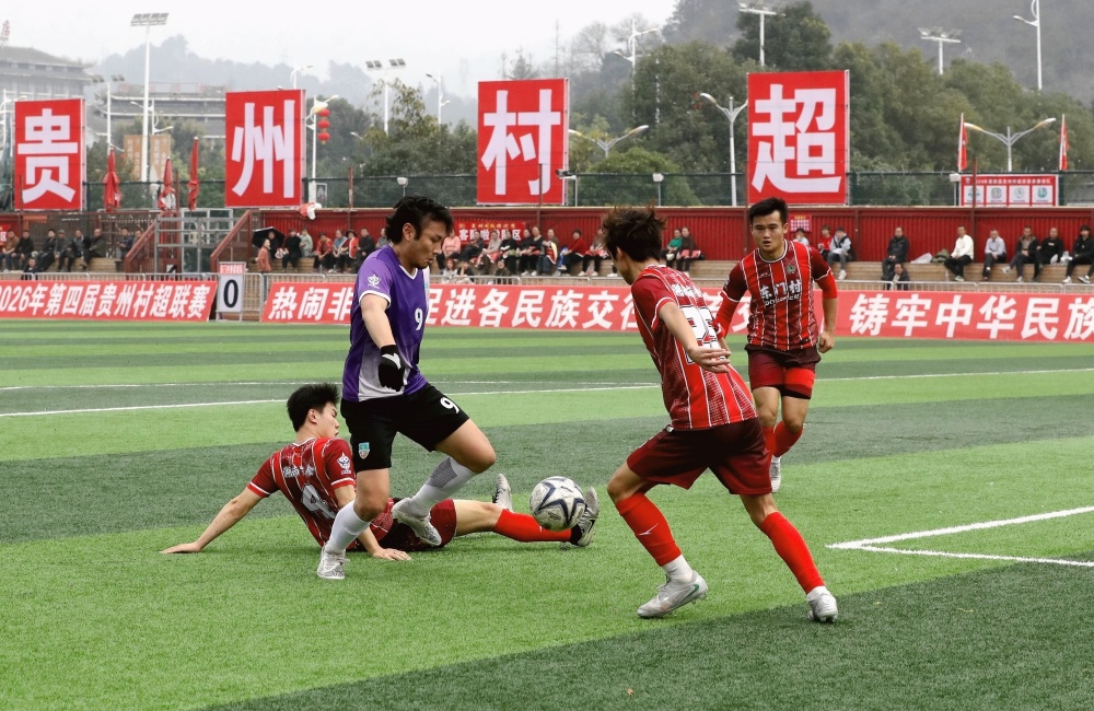 1月17日,在贵州省黔东南苗族侗族自治州榕江县城北新区“村超”足球场,榕江县朗洞镇色边村足球队员(红衣)与古州镇月寨村足球队员在比赛中激烈拼抢。