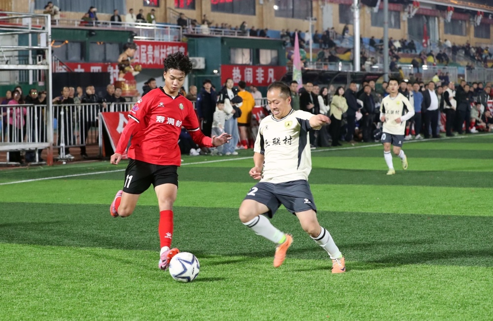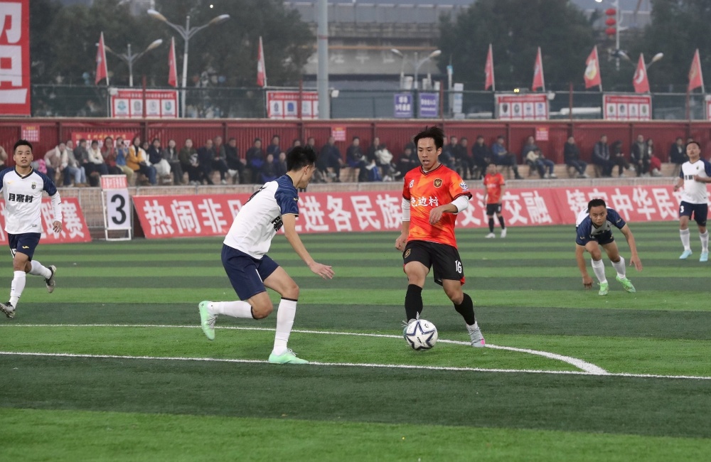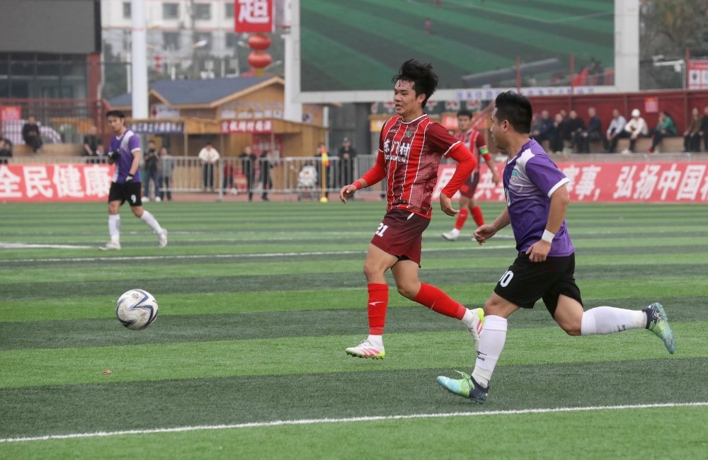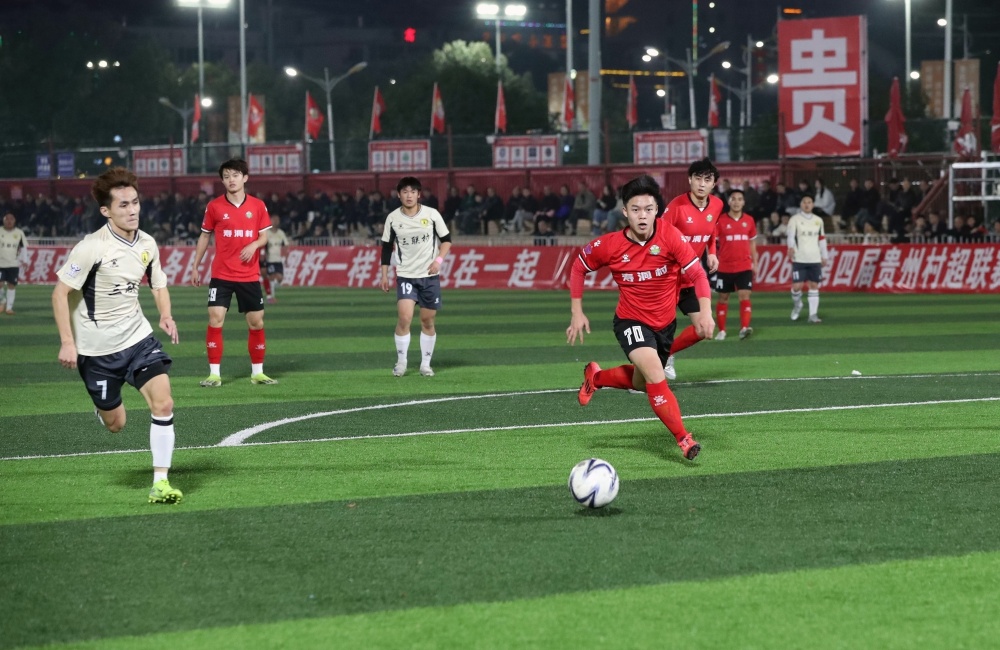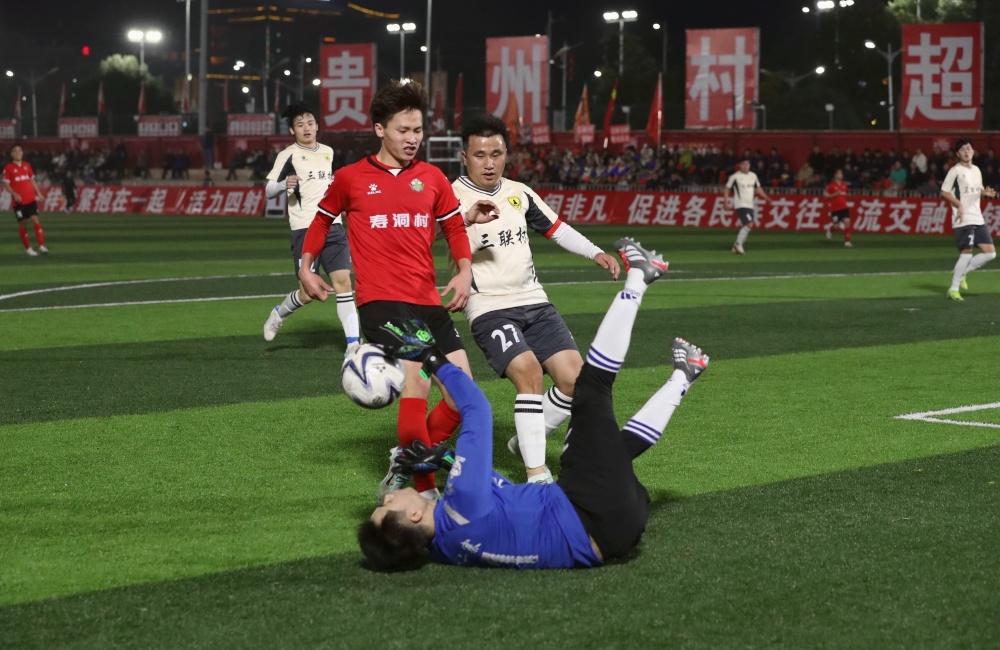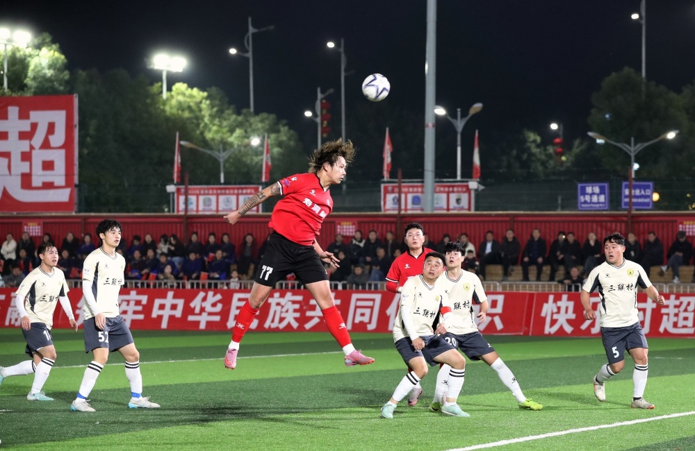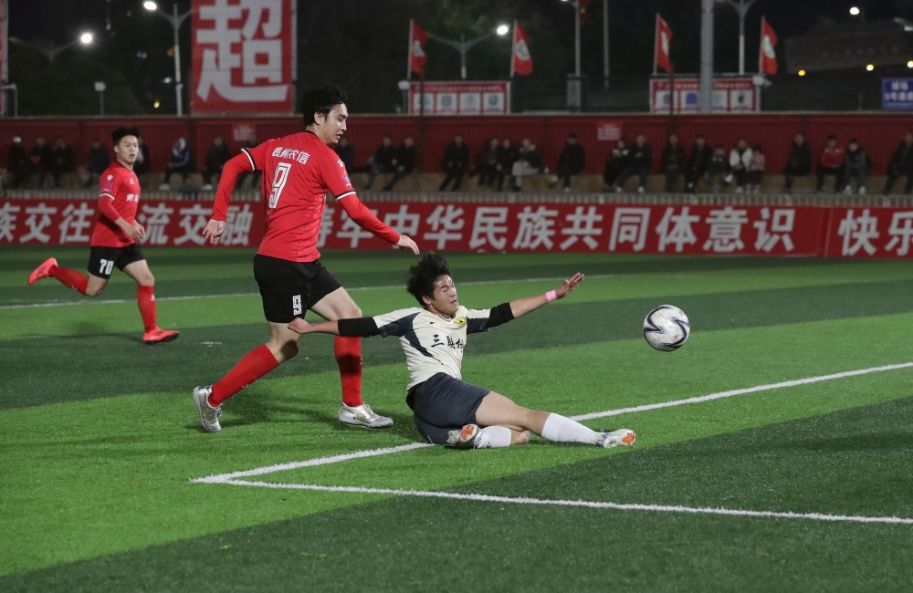 1月17日,在贵州省黔东南苗族侗族自治州榕江县城北新区“村超”足球场,榕江县朗洞镇色边村足球队员(红衣)与古州镇月寨村足球队员在比赛中激烈拼抢。