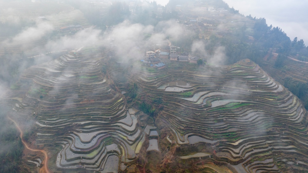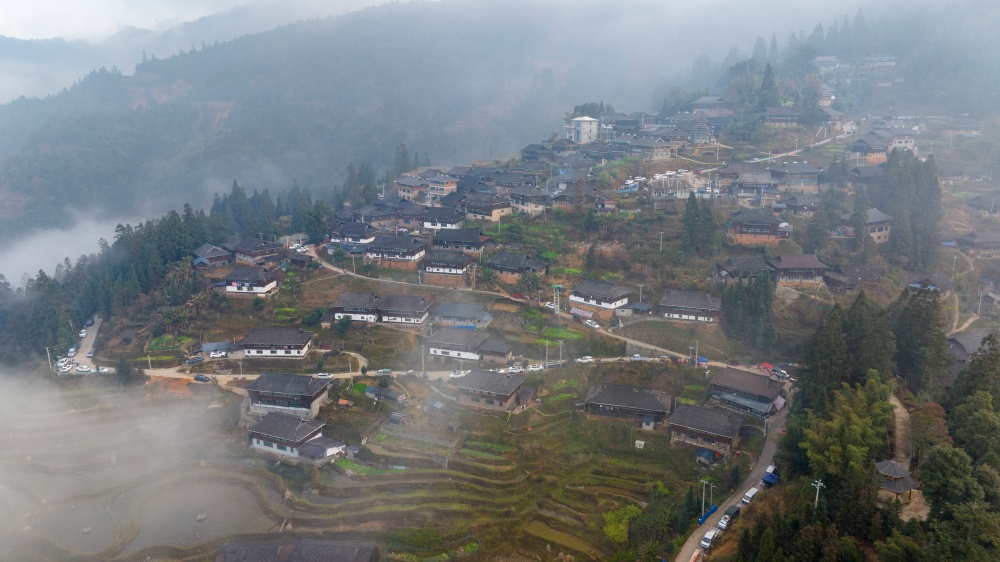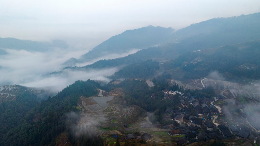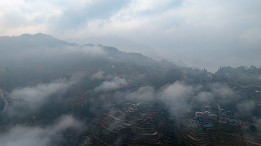 当日,贵州省黔东南苗族侗族自治州从江县翠里瑶族壮族乡岑丰村、南岑村一带云雾缭绕,层叠的梯田、青翠的山峦与古朴的苗家吊脚楼在晨雾中若隐若现,构成一幅静谧的水墨画卷。