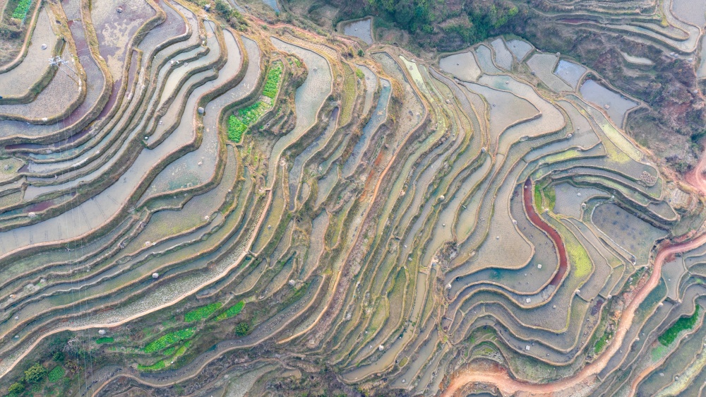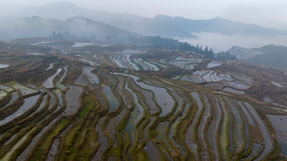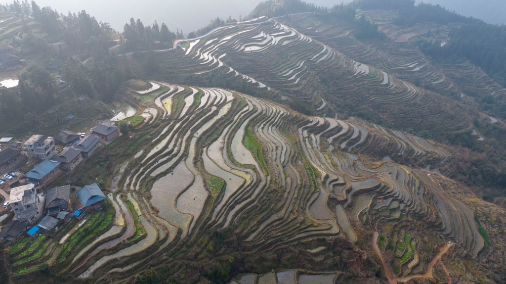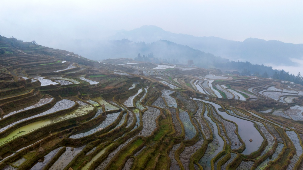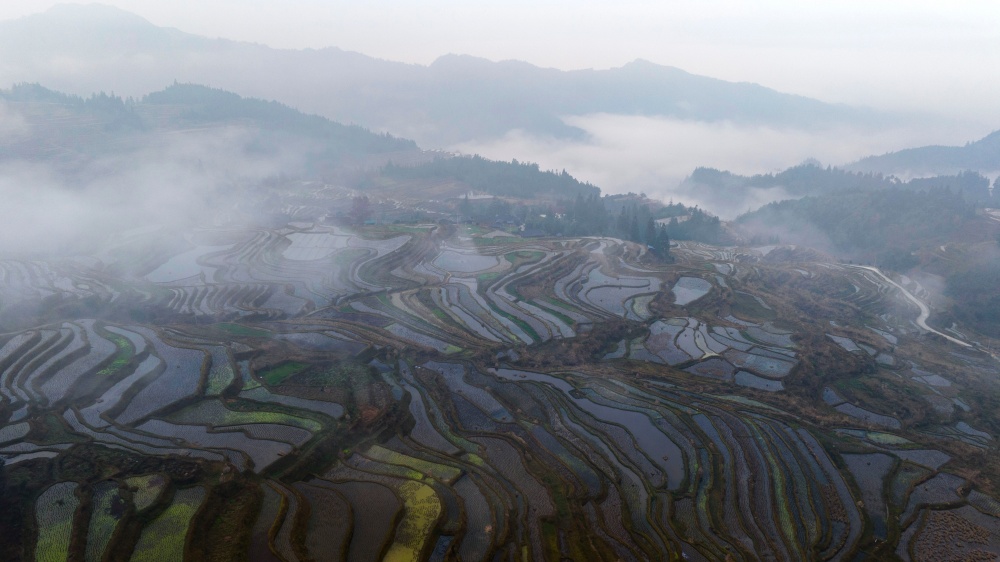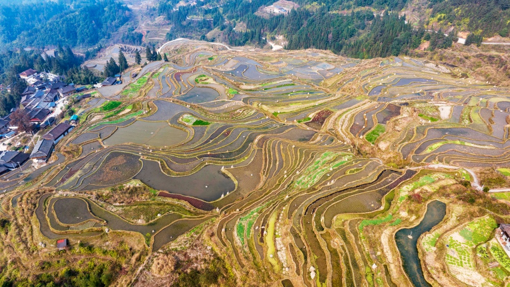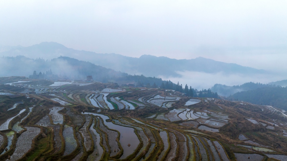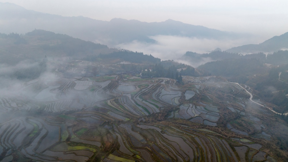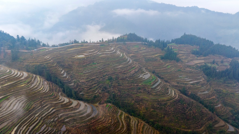 1月17日,拍摄的贵州省从江县翠里瑶族壮族乡岑丰村梯田美景(无人机照片)。