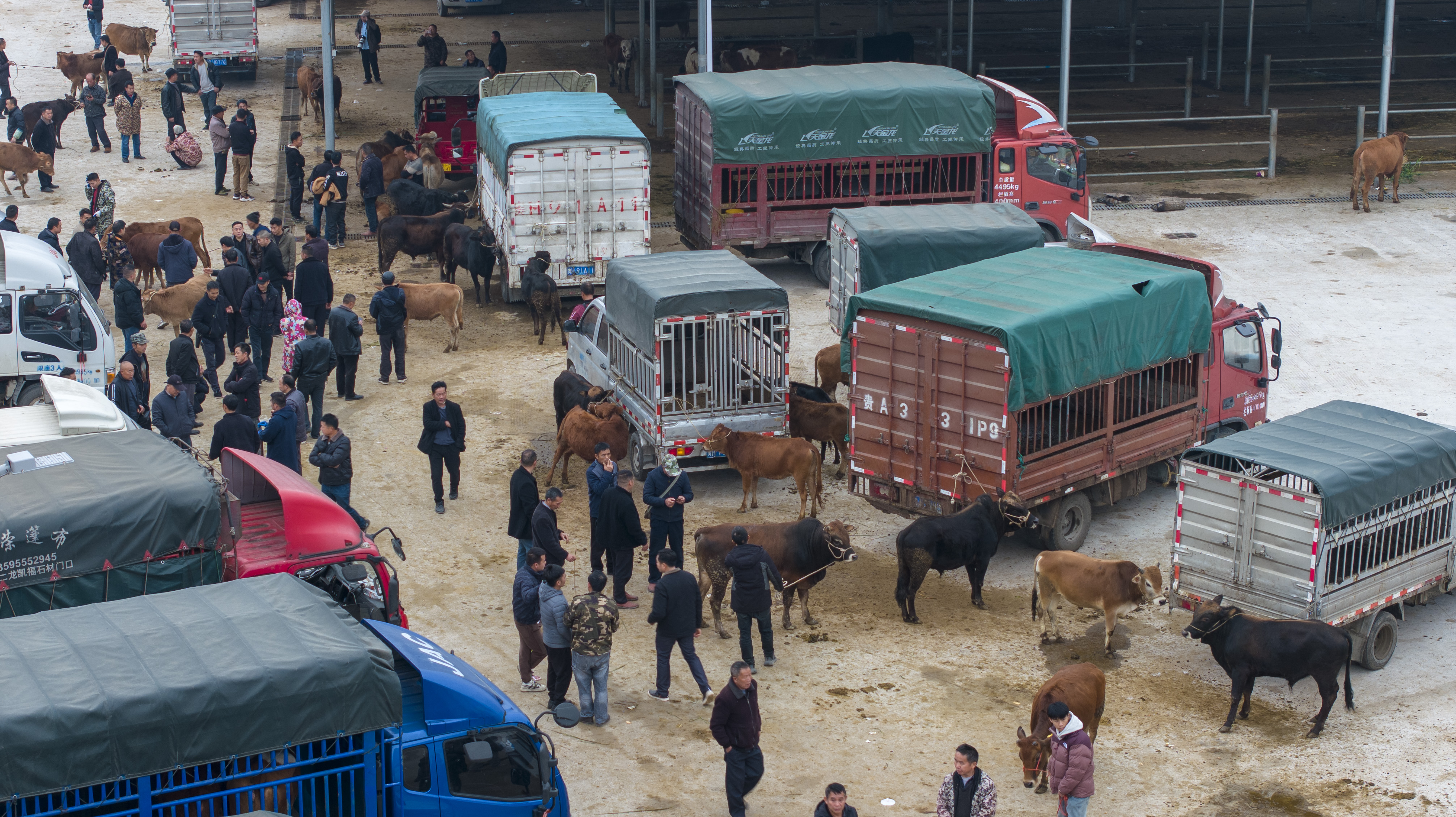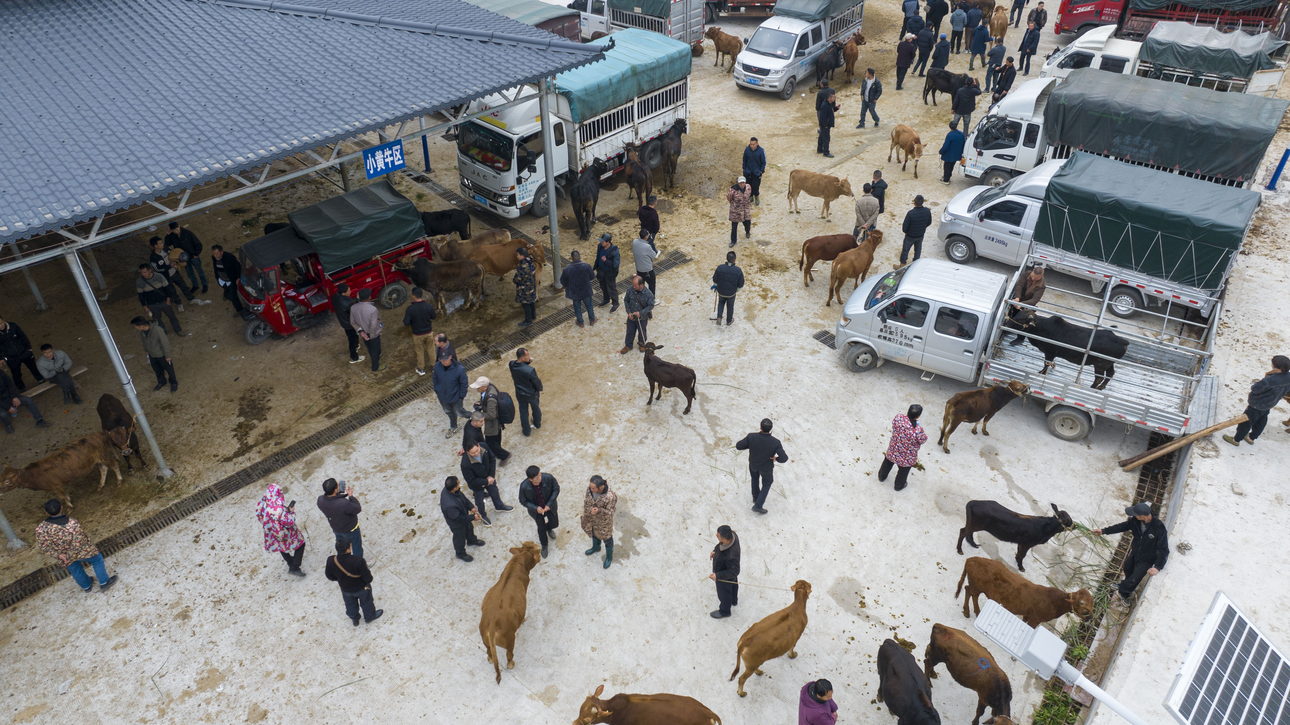 当日是农历腊月初一,贵州省黔东南苗族侗族自治州从江县洛香镇“小牛超市”迎来交易日,众多养殖户和购牛者在此挑选交易,市场内人气兴旺,一片繁忙。