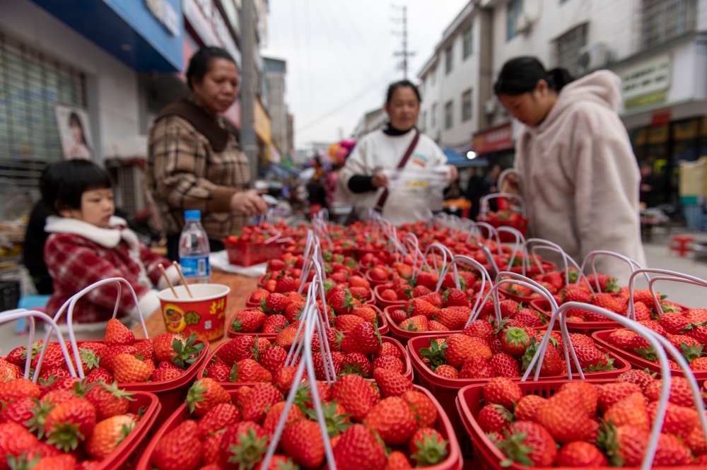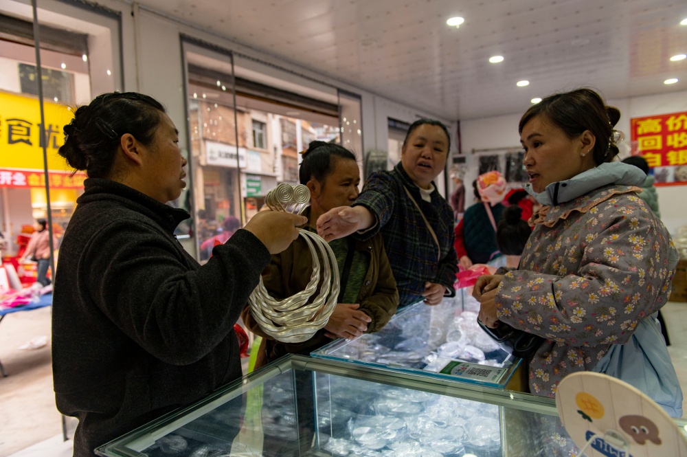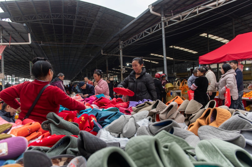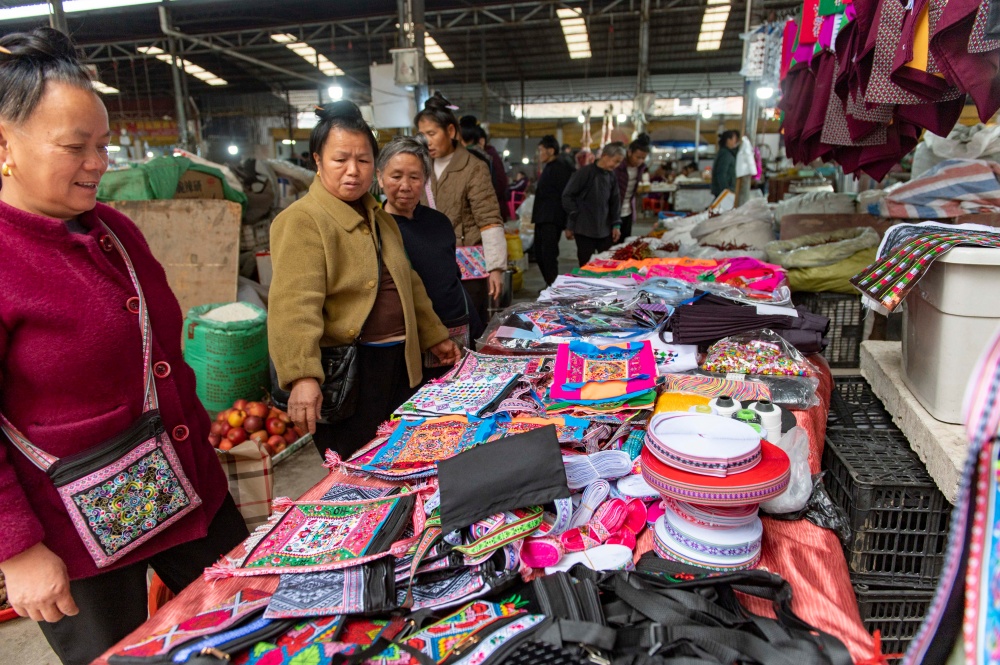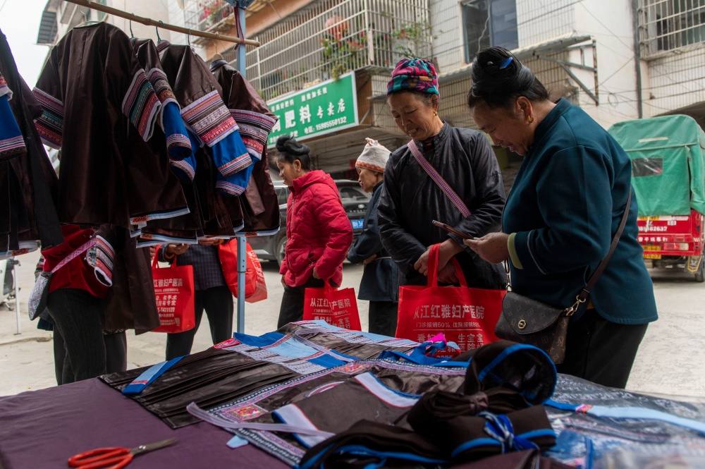 1月19日,人们在贵州省从江县洛香镇农贸市场选购衣物。