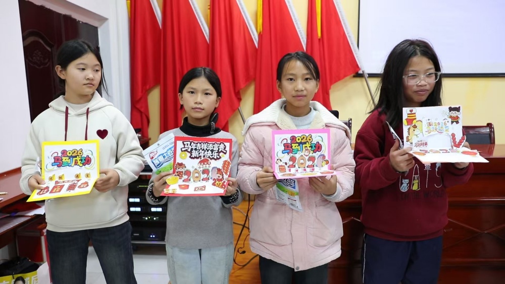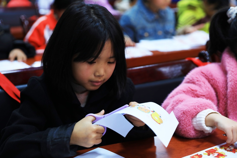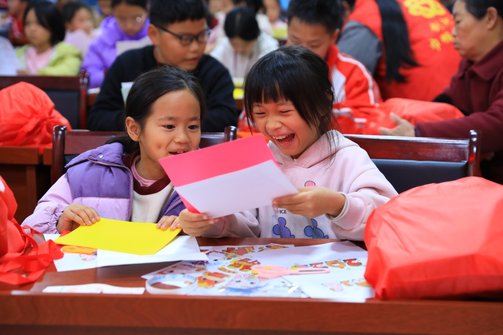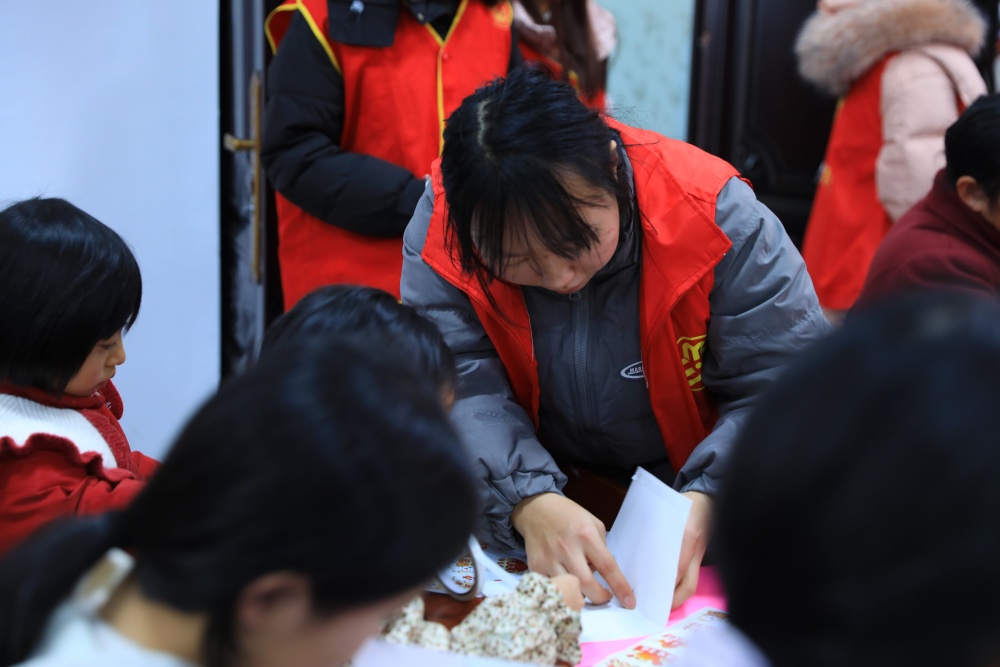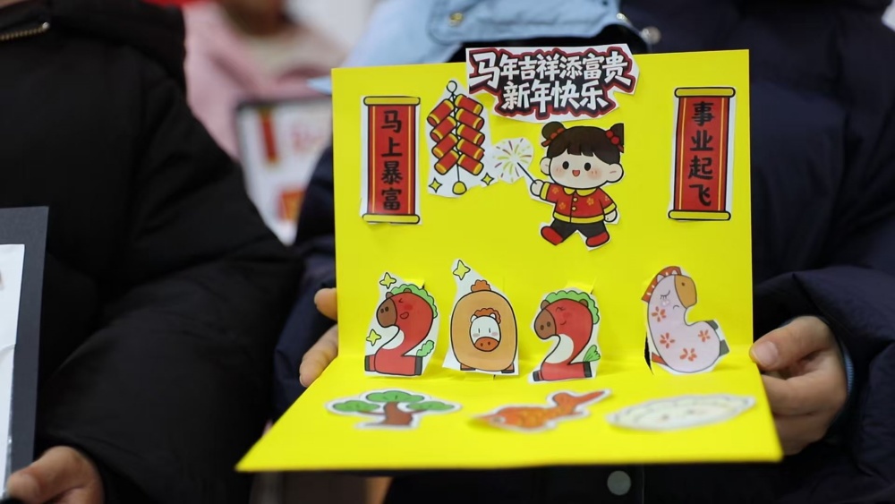 在最后的贺卡制作环节,孩子们充分发挥想象力,用彩笔细心勾勒、贴纸精心点缀,制作出独一无二的新年贺卡。志愿者在一旁耐心协助,鼓励孩子们将心中的祝福化作纸上的图案与文字。