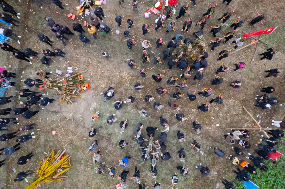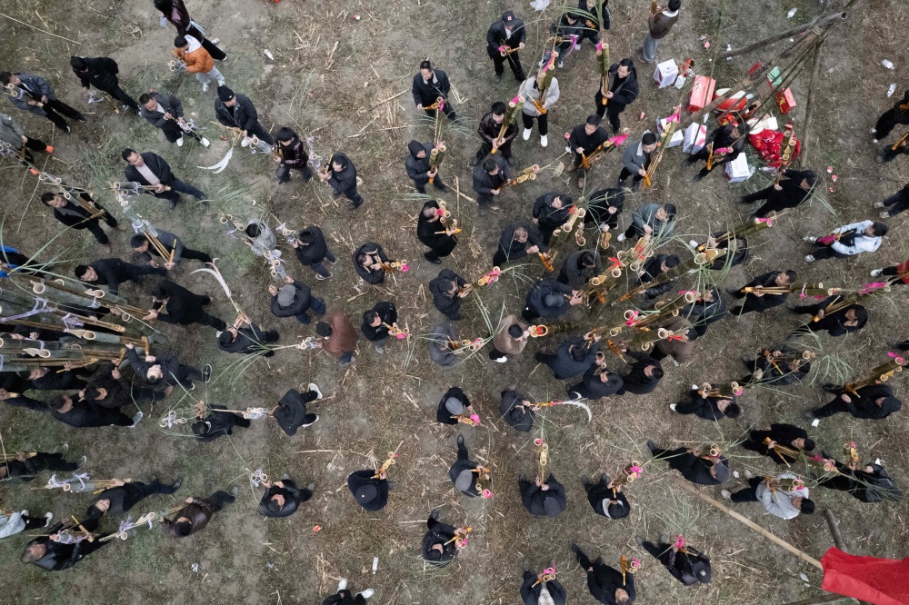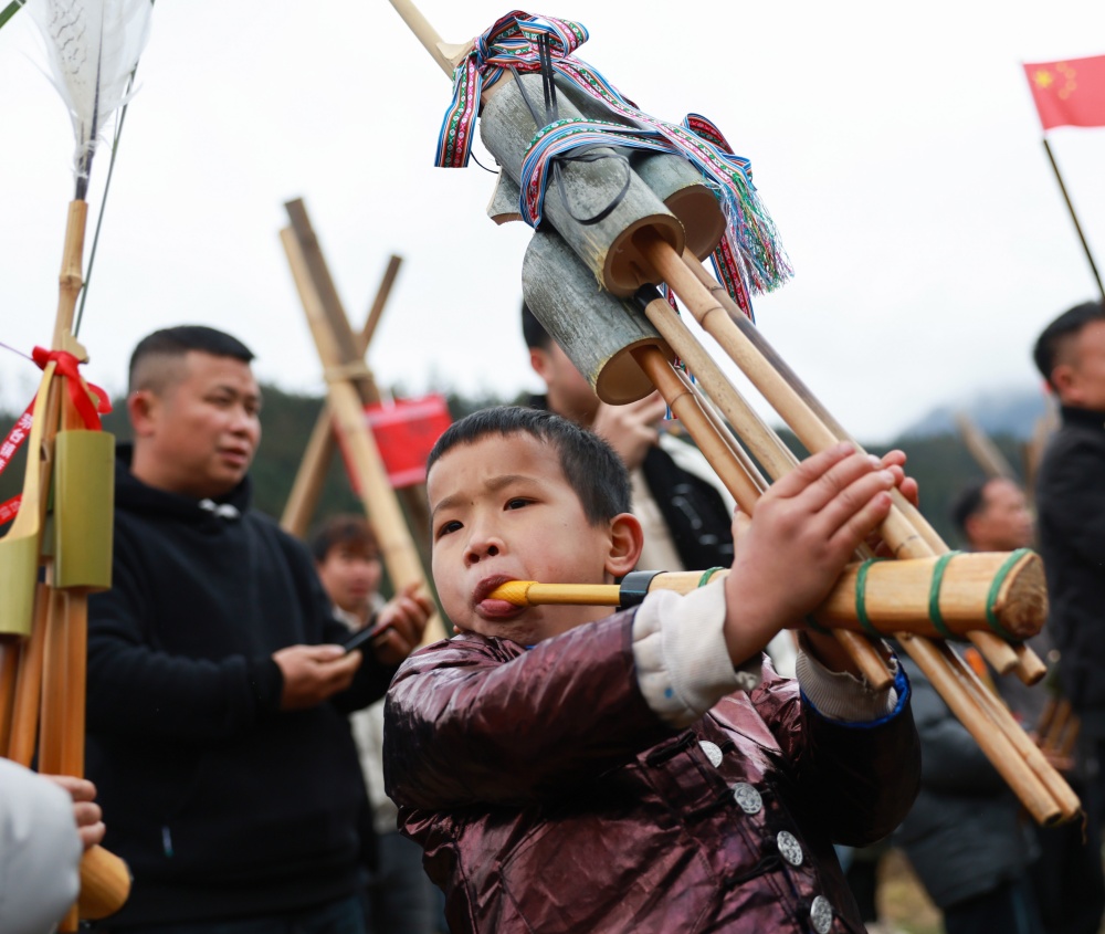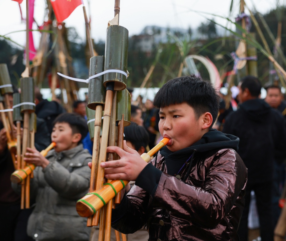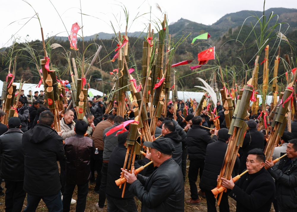1月20日,在贵州省黔东南苗族侗族自治州从江县刚边壮族乡平正村宰船芦笙堂,壮族群众在吹奏芦笙。