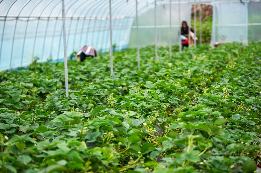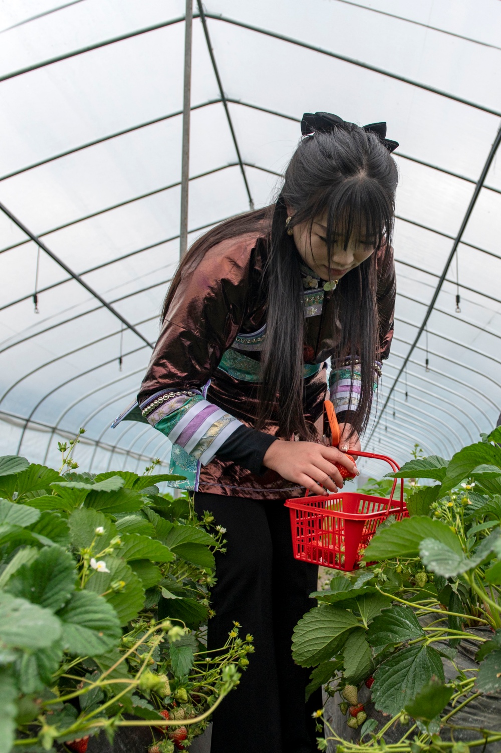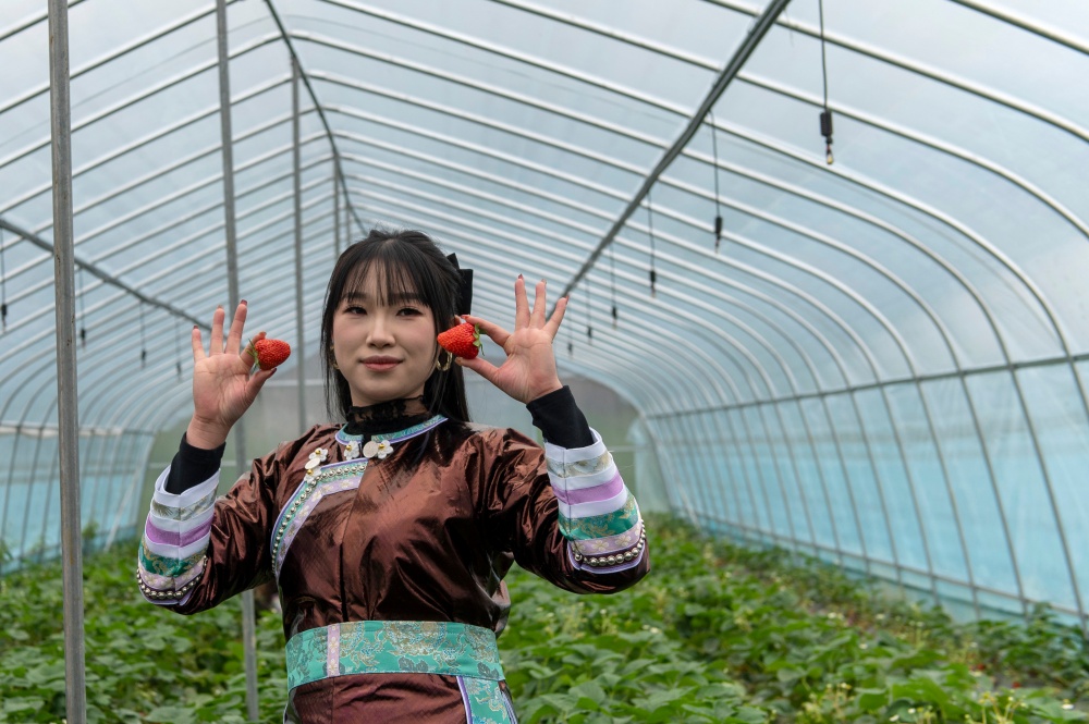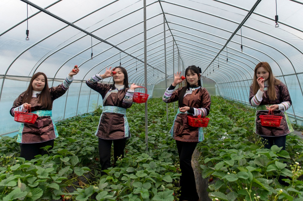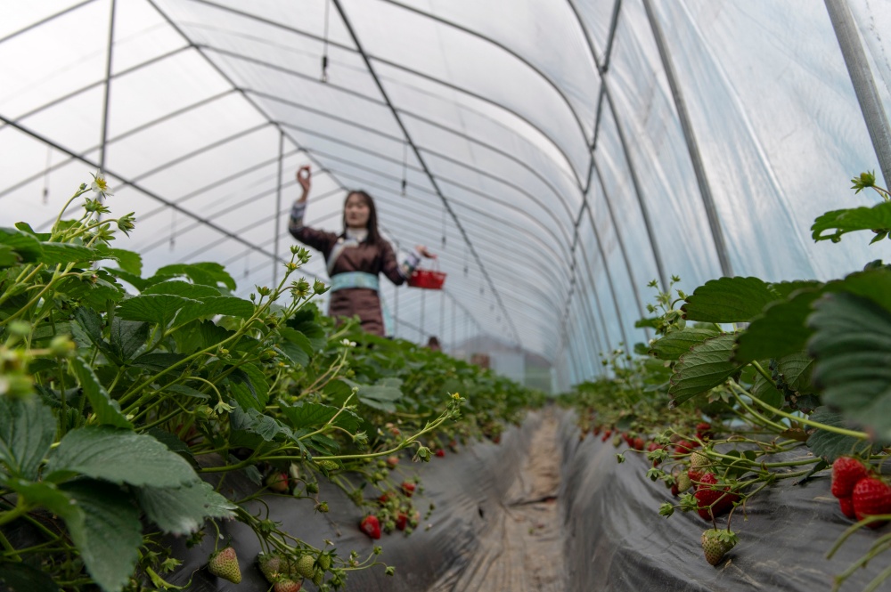 大寒时节,贵州省黔东南苗族侗族自治州从江县刚边壮族乡平中村的草莓种植大棚里,游客正在体验采摘乐趣。