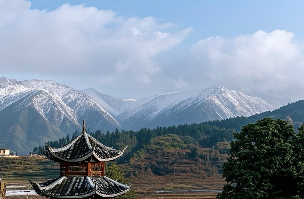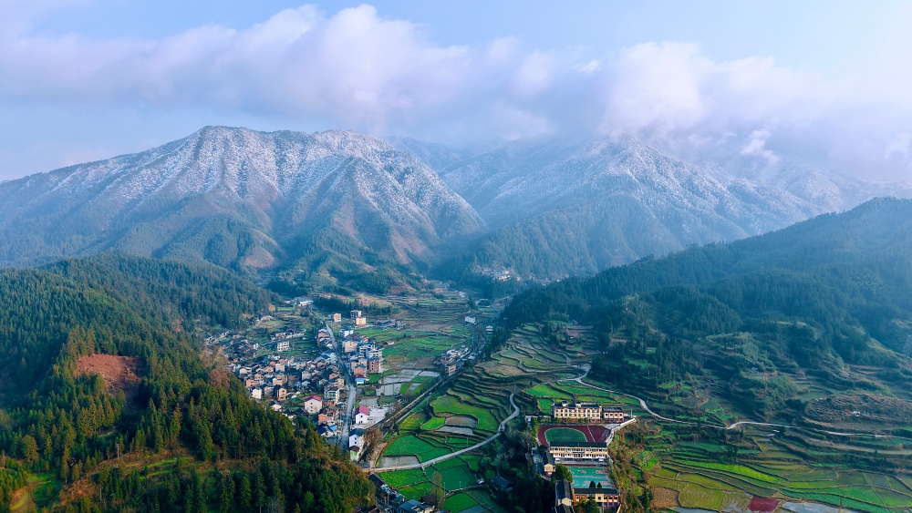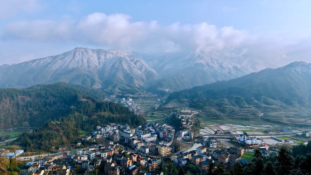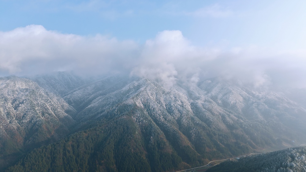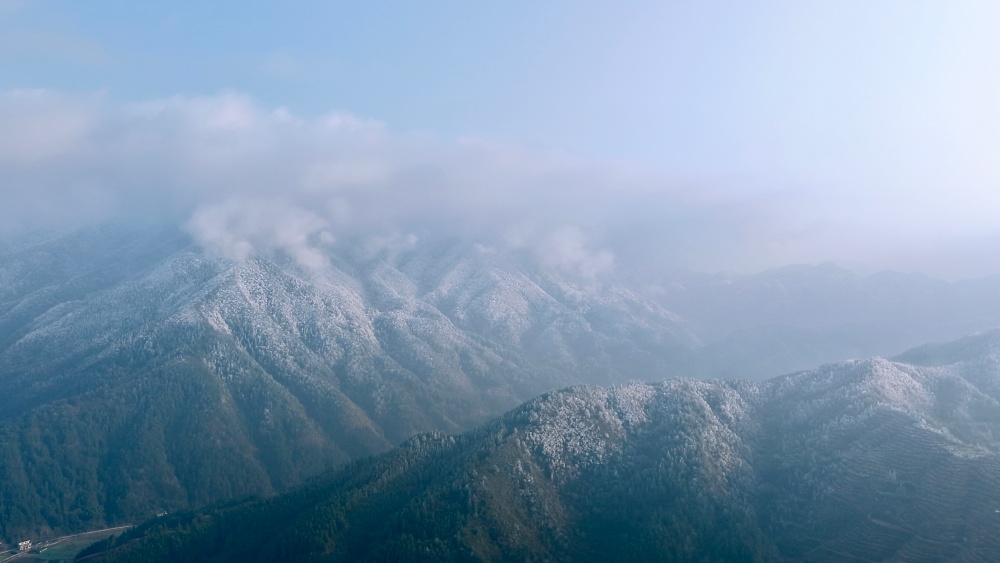 近日,三穗县迎来了一轮寒潮降温天气,位于该县良上镇的最高峰——老山坡迎来了银装素裹的胜景。雪后初晴,阳光洒落,青蓝天空如洗,乳白云絮轻飘,皑皑白雪覆满山峦,山麓村庄静谧,构成了一幅诗意盎然的山水画卷,放眼望去,宛若仙境,美不胜收。