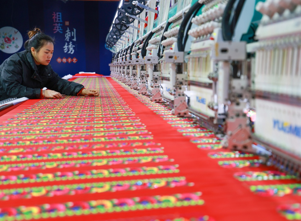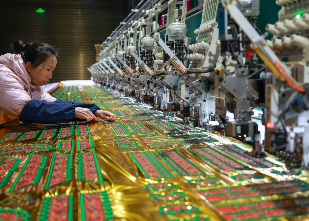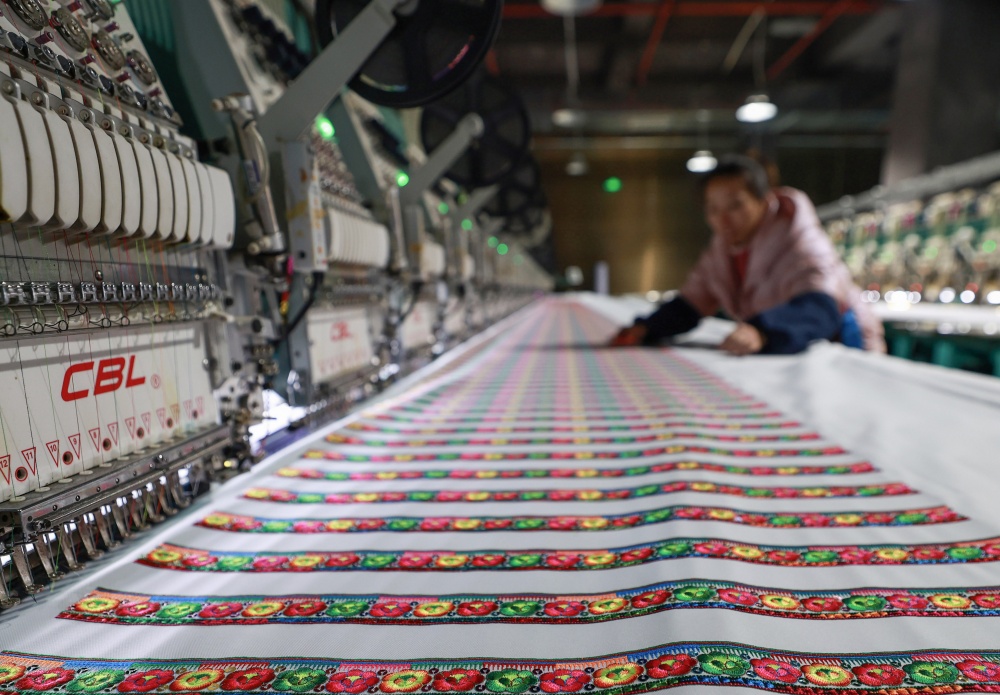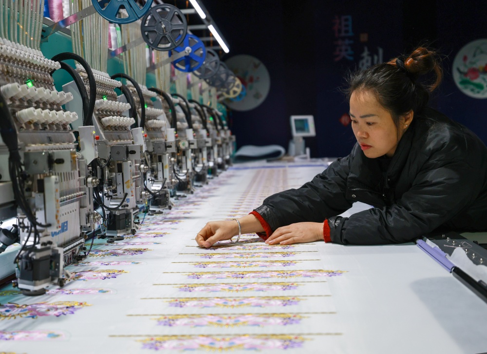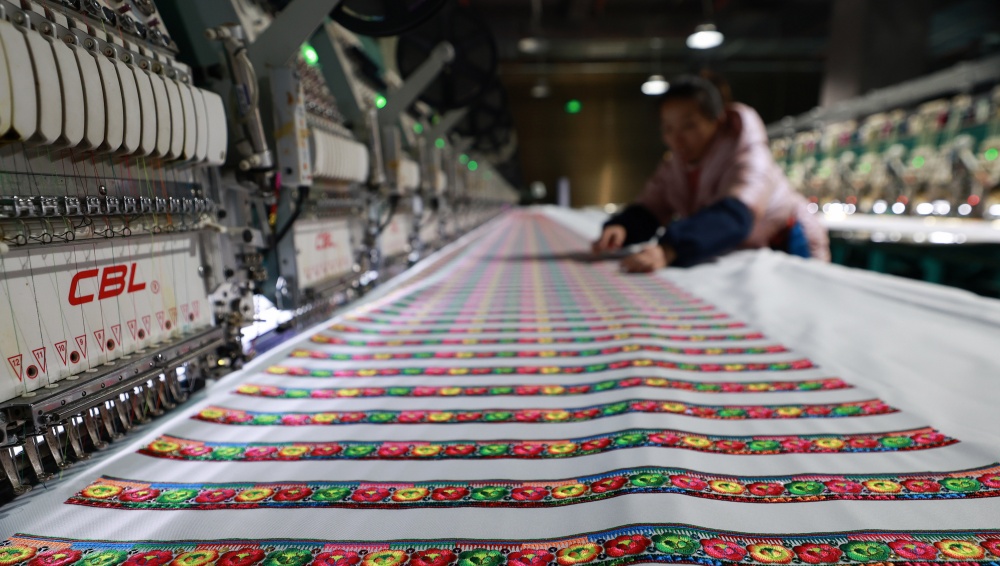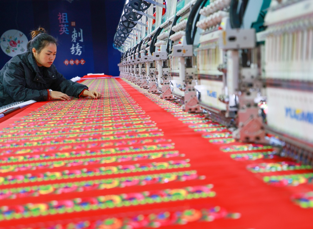 1月25日,在贵州省从江县贯洞镇美娥社区刺绣生产车间内,工人们飞针走线、各司其职,赶制订单忙而有序,车间内一派繁忙的景象。