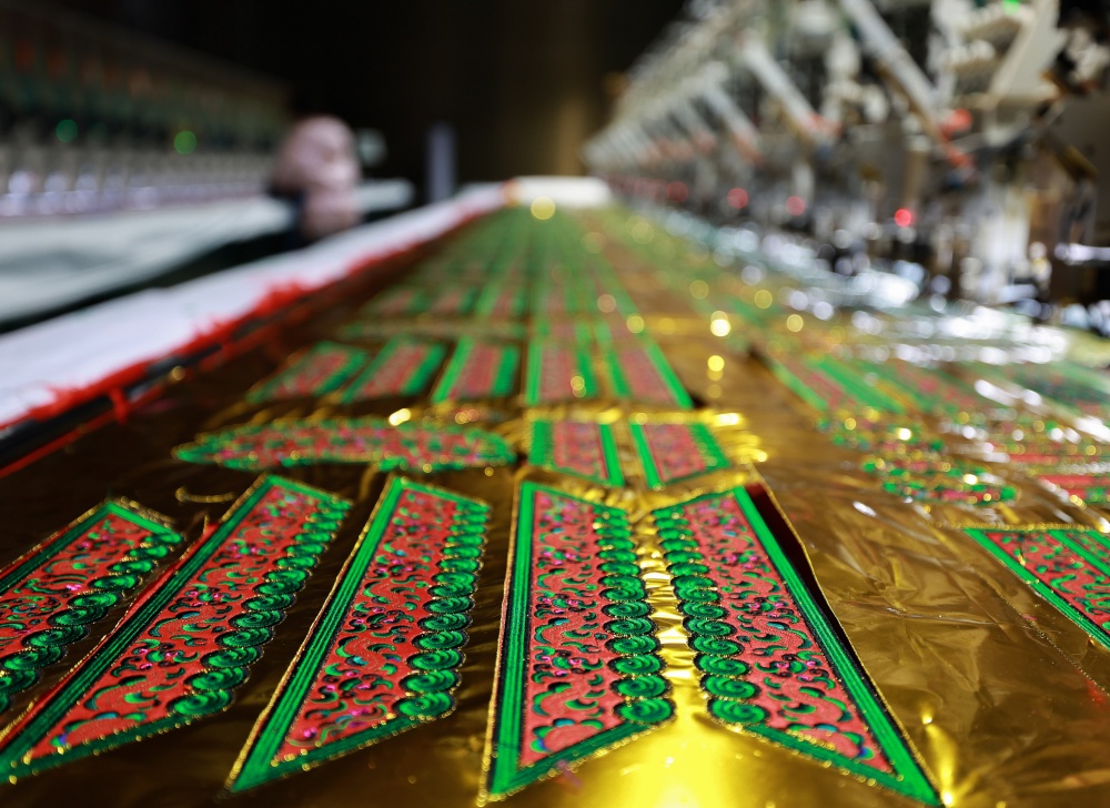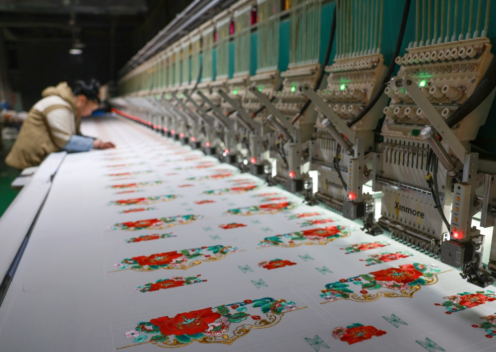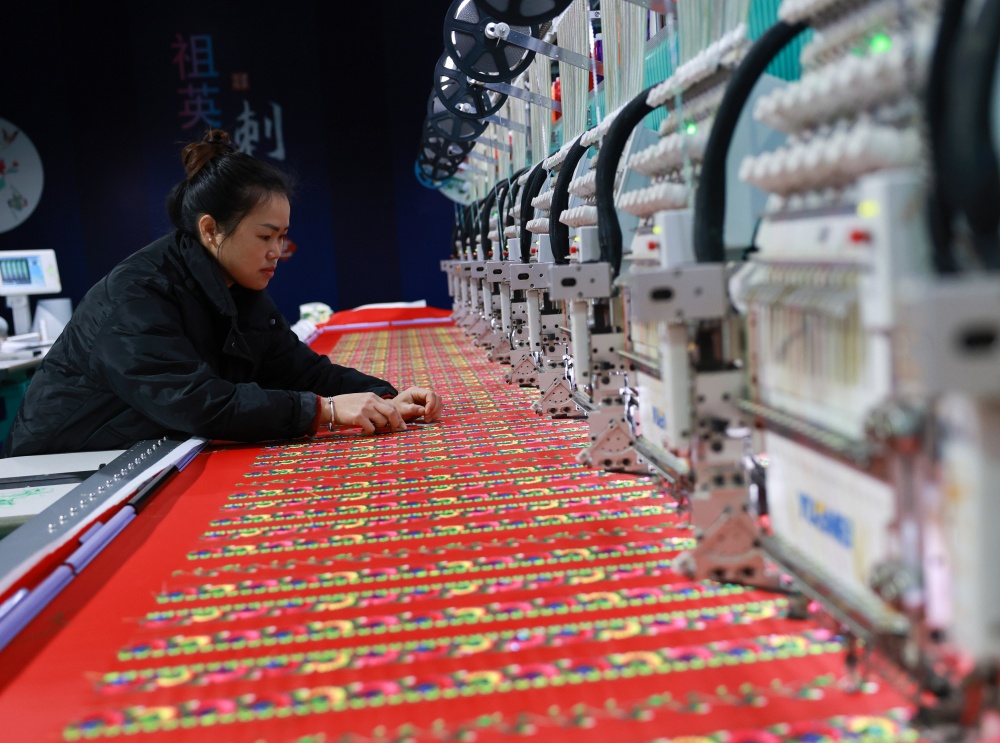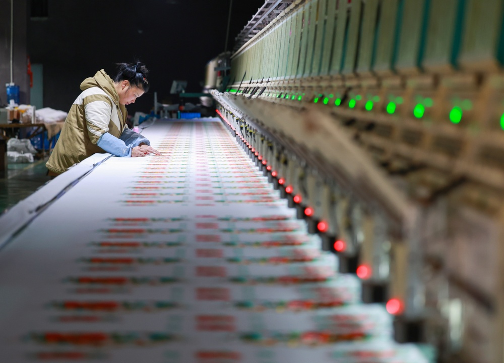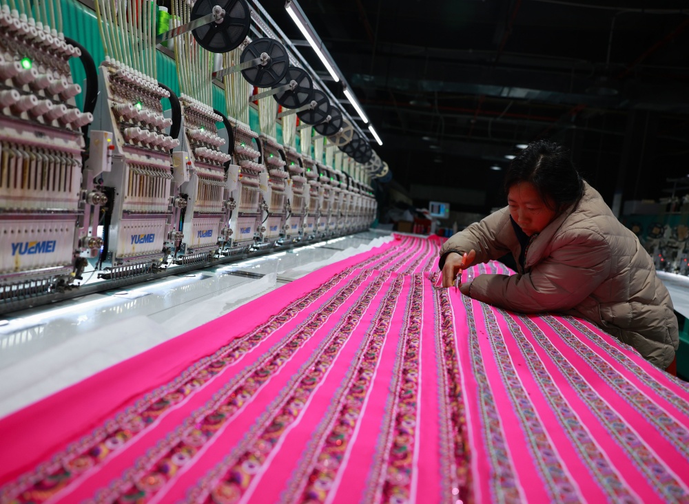 1月25日,在贵州省从江县贯洞镇美娥社区刺绣生产车间内,工人们飞针走线、各司其职,赶制订单忙而有序,车间内一派繁忙的景象。