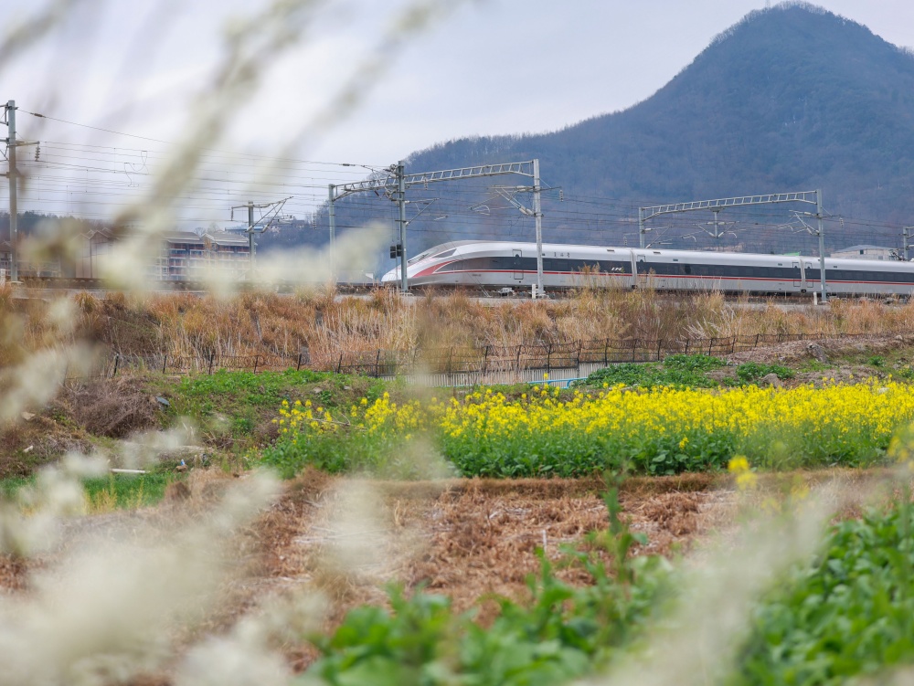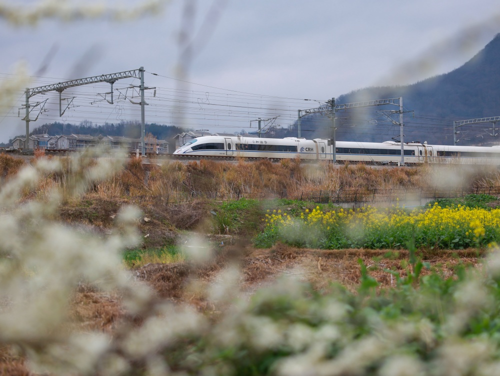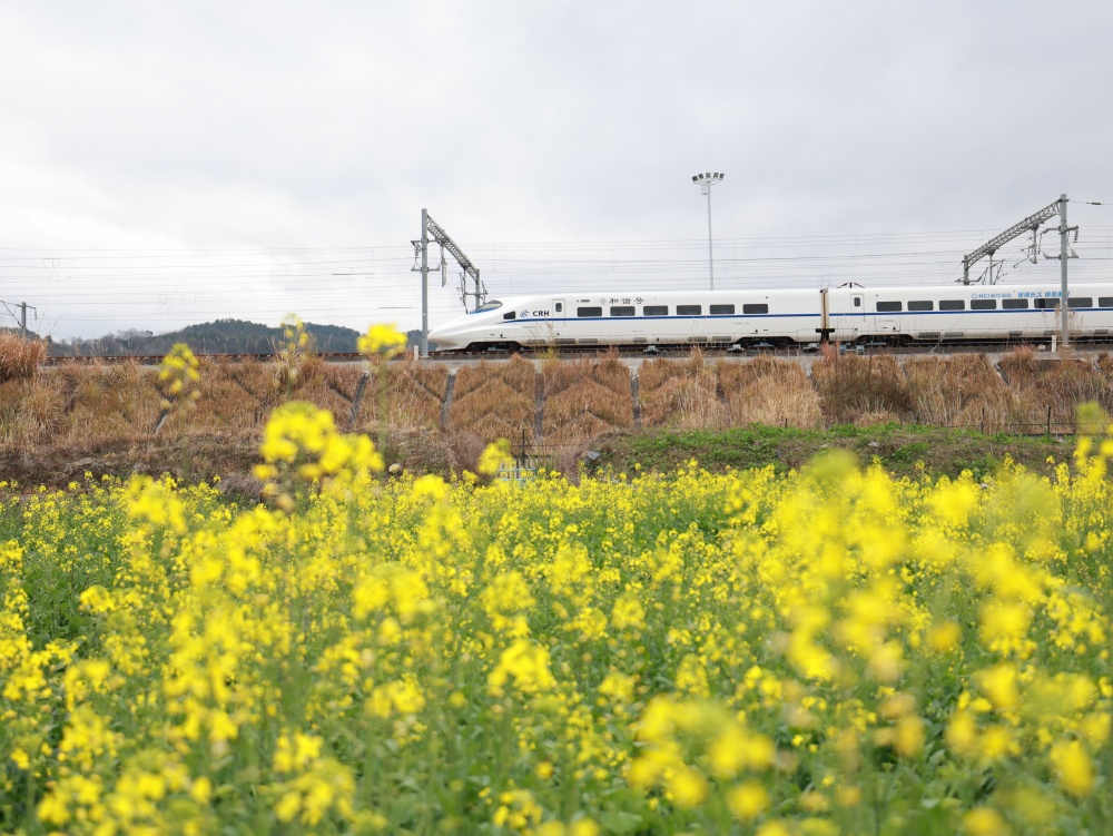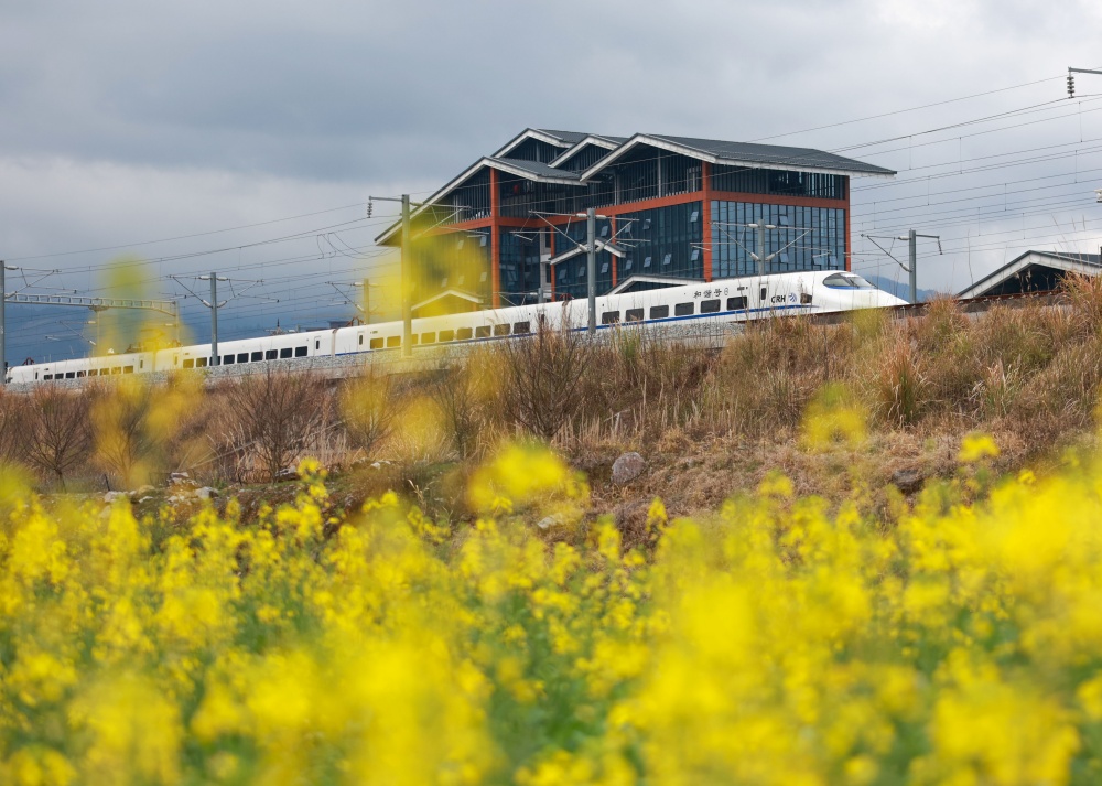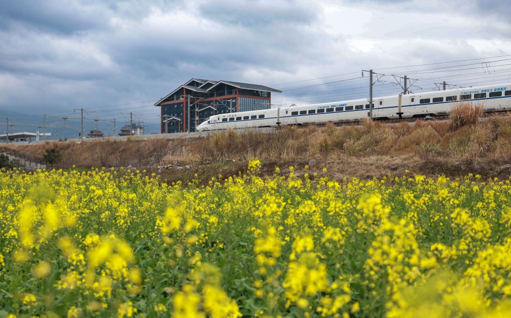 1月25日,早春时节,贵州省黔东南苗族侗族自治州从江县境内,连片油菜花次第绽放,金黄油菜花与青山相映成趣。一列列列车穿行其间,汽笛轻鸣,勾勒出一幅“车在画中行,人在景中游”的春日画卷,美不胜收。
