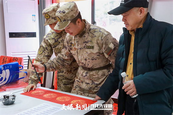 在民俗互动送福环节,来自市文联的书法、剪纸老师们现场挥毫泼墨、巧手创作。一一幅幅笔力遒劲的春联、一个个寓意吉祥的“福”字,一张张惟妙惟肖的剪纸作品,承载着对官兵及军属的美好祝愿,被一一送到大家手中。官兵们与军属们兴致勃勃地参与其中,或驻足欣赏艺术创作,或挑选心仪的春联福字,现场洋溢着欢声笑语,浓浓的年味与军民温情交织在一起。