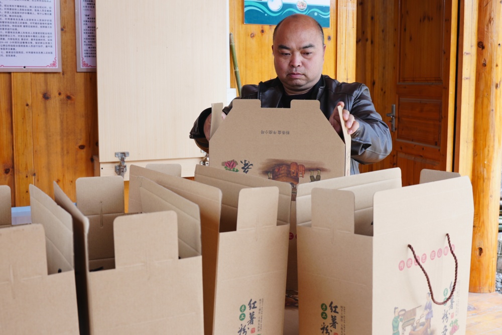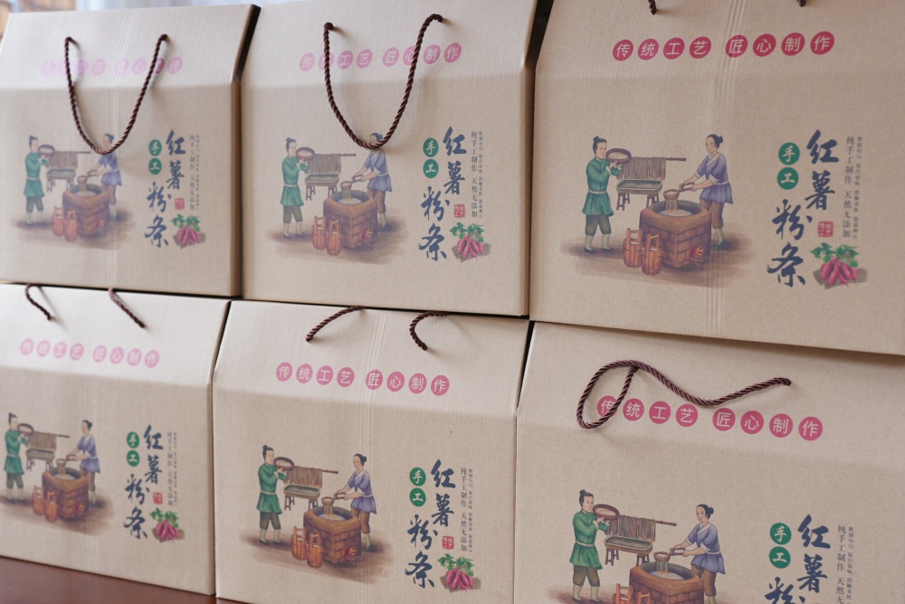 塔山村盛产淀粉含量高的优质红薯,但过去村民多以售卖原料为主,收益有限。今年,周邦泽大胆尝试深加工,将红薯变身粉条。“附加值翻了几倍!”他兴奋地介绍。短短半个月,加工场已产出千斤红薯粉。依托微信朋友圈和邻里口碑,300余斤红薯粉迅速售罄,回头客络绎不绝。“年关是旺季,只要口碑打出去,不愁销路!”周邦泽指着精心设计的礼盒包装产品说,“这特别适合拜年送礼、走亲访友。”