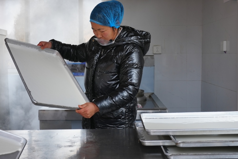 走进周邦泽的加工场,蒸汽缭绕中,只见村民熟练地将乳白色红薯粉浆舀入蒸盘,手腕轻转间,粉浆便均匀铺展成规整的方片。送入蒸锅片刻,粉浆便凝结为温润透亮的粉块,随后被迅速转移到晾晒架上,浓郁的薯香随之弥漫开来。
