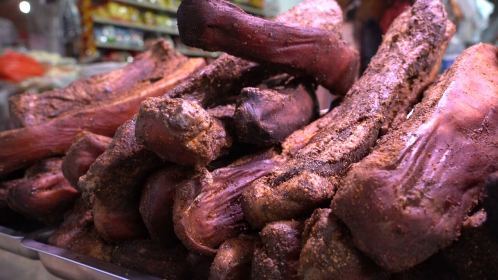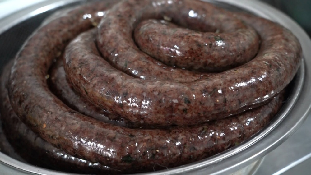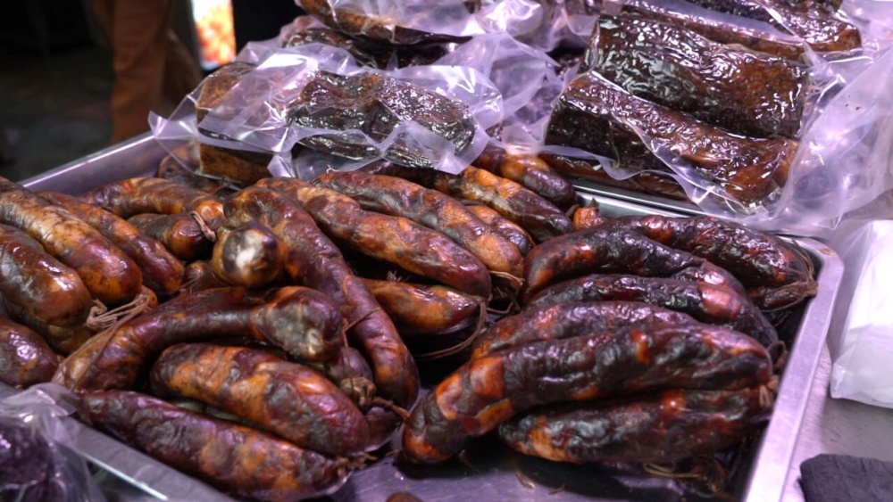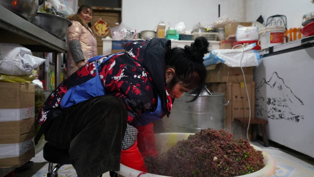 除了软糯可口的糍粑是市民必买的年货之外,手工血肠也是大家争相购买的年货之一。年关将至,商户吴兰收到的腊味订单量逐日上涨,据她介绍,每天都要做100斤以上的血肠、腊肉、血豆腐等产品。因味道醇厚、口感独特,深受老食客青睐,并通过线上线下销售,满足年货市场需求。