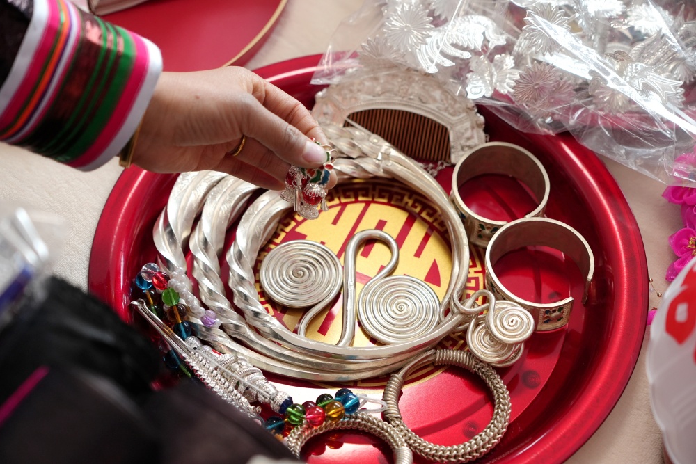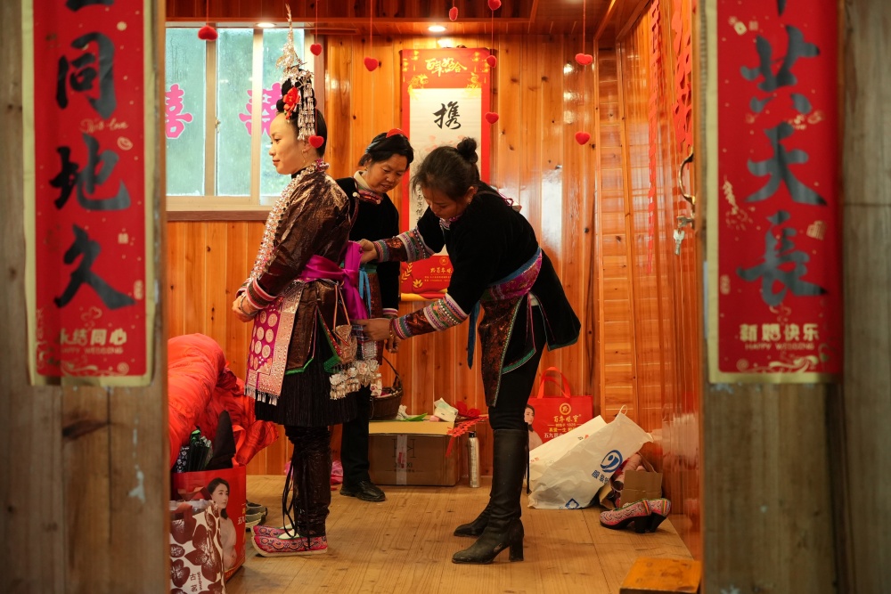 婚房里,亲友们一边说笑一边帮新娘子整理衣裳、戴好银饰。邻里姐妹们也也穿上侗衣、戴好银饰,陪伴左右,每个人的脸上都洋溢着喜气。