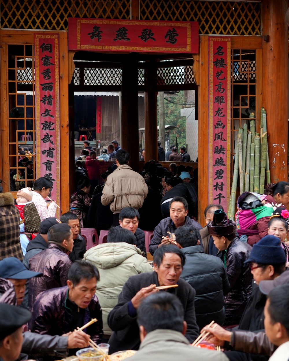 新郎新娘一起露面后,仪式感满满的“合拢宴”在鼓楼边开场。桌上满是侗家特色菜,乡亲们七八人一桌,围着鼓楼坐下,吃得热闹,聊得亲切。