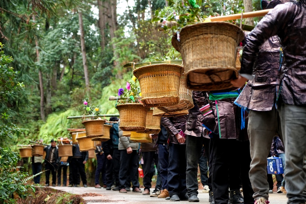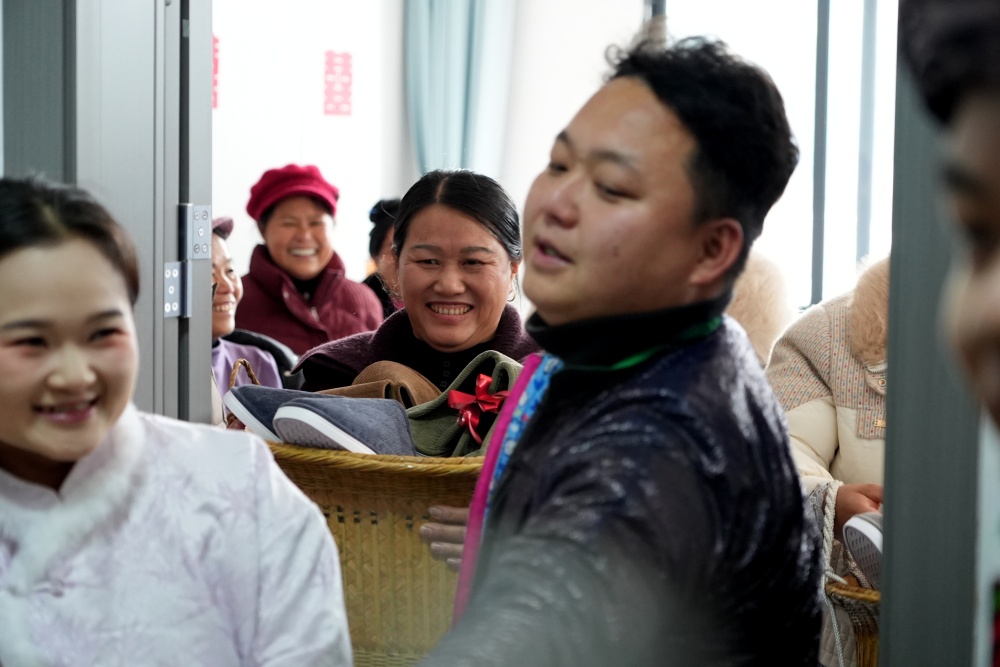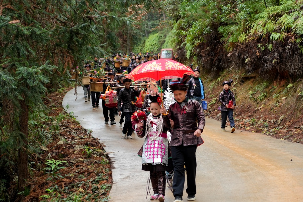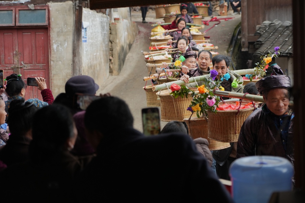 吉时一到,接亲队伍挑着满满当当的彩礼,浩浩荡荡走过弯弯山路,奔向新娘家。刚到鼓楼,新娘家人早已静候。没有喧哗,只有目光温暖地迎接着队伍进门。大家安静看着彩礼一样样挑进家门,场面庄严又暖心。