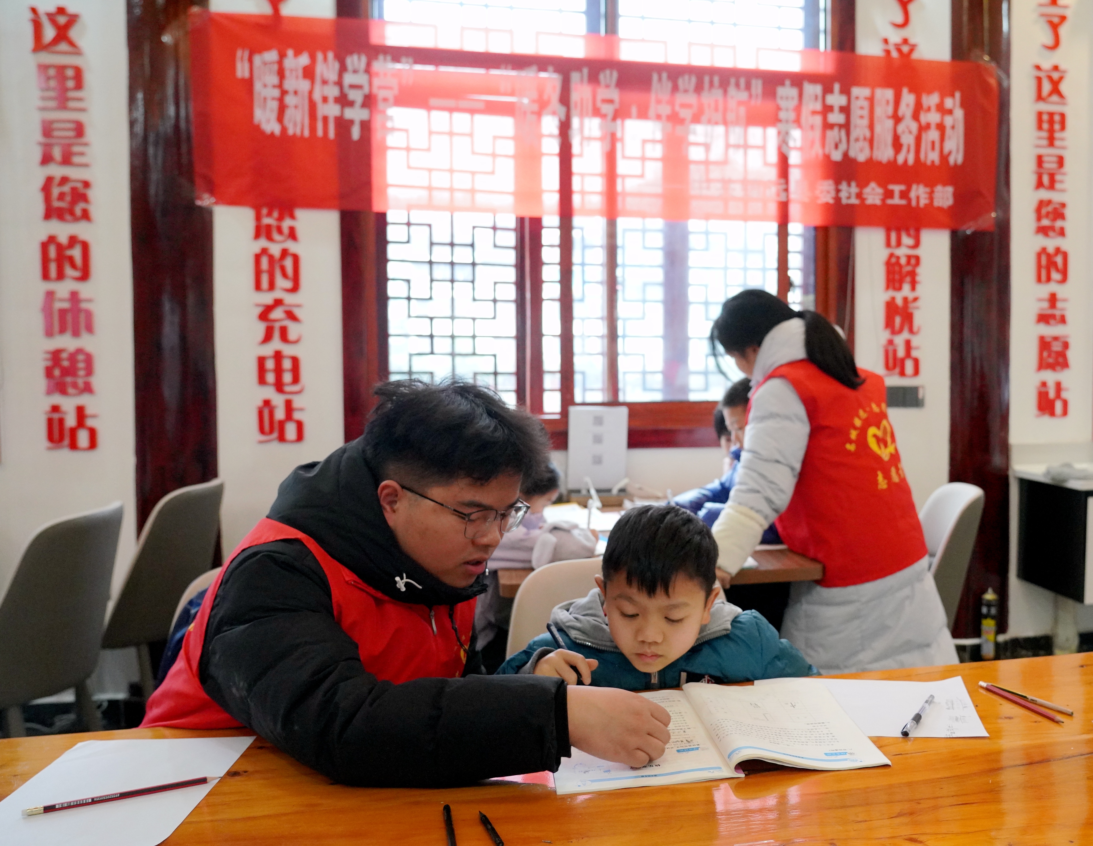 冬日寒风拂,温情伴学行。1月28日上午,镇远县新就业群体党群服务站内暖意融融、温情涌动,由镇远县委社会工作部主办的“暖‘新’伴学营”——“暖冬助学·伴学护航”寒假志愿服务活动有序进行。活动聚焦新就业群体家庭假期“看护难、辅导难”痛点,以“学业辅导+成长关怀”为核心,为孩子们搭建起安全、充实、温暖的寒假成长平台。