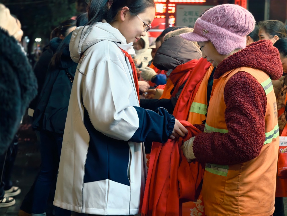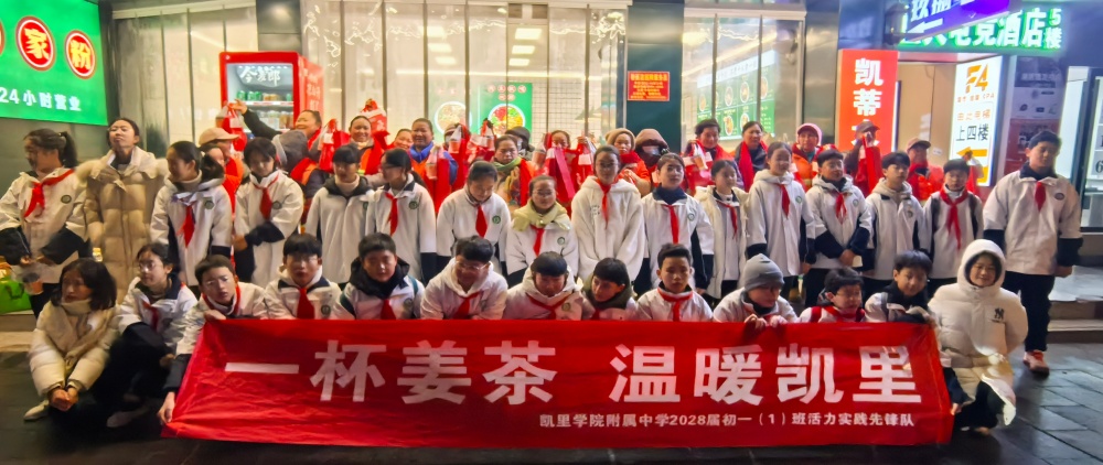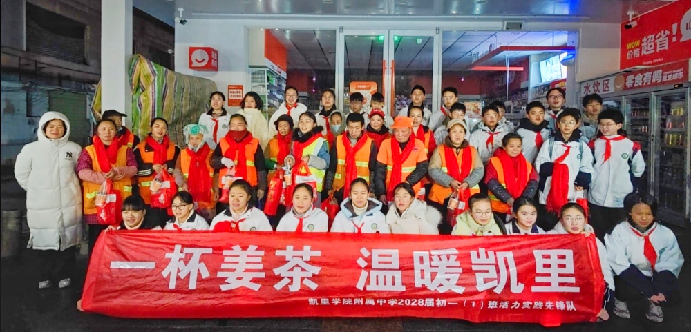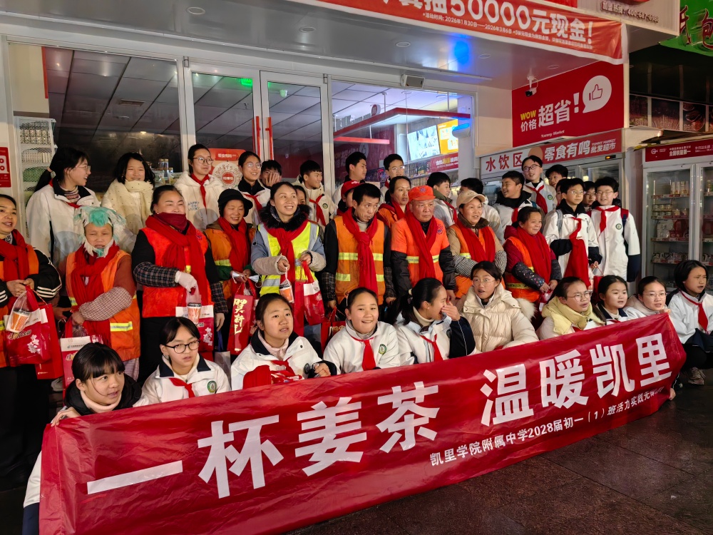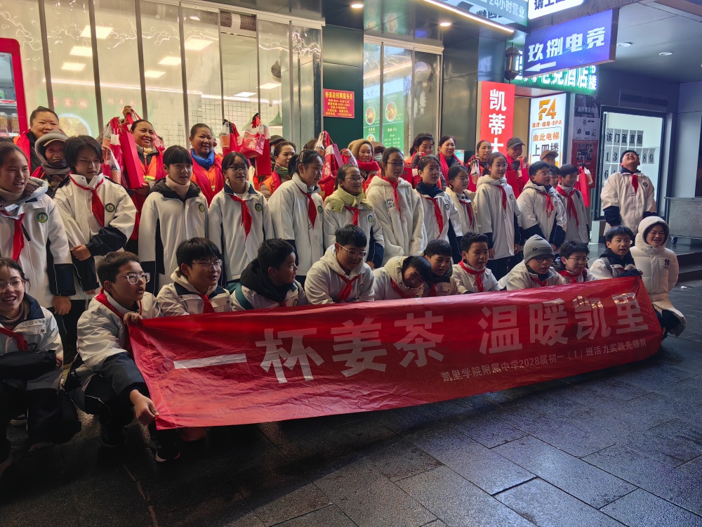 他们是凯里学院附属中学2028届初一(1)班“活力实践先锋队”的老师、同学与家长志愿者们,他们用“一杯姜茶·温暖凯里”的志愿活动,送暖环卫工人。