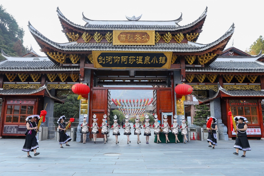 距离八郎不足10公里的剑河仰阿莎温泉小镇,则是另一番热闹景象。游客们沐浴在氡硫温泉泡池中,尽享山水与人文相融的惬意时光。优质的旅游体验,使其愈发成为周边游客温泉旅游的首选之地。