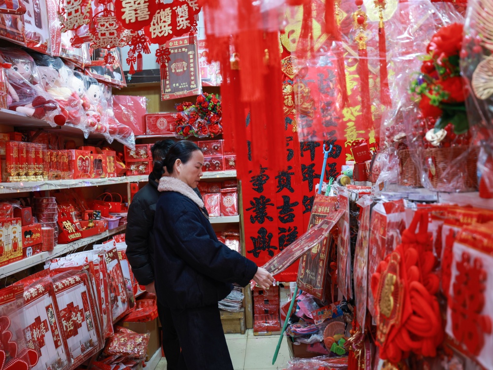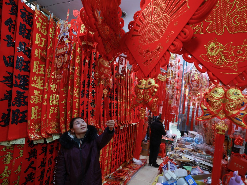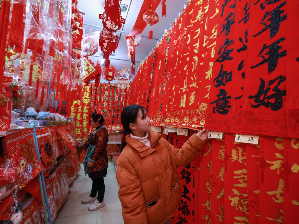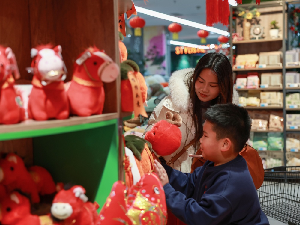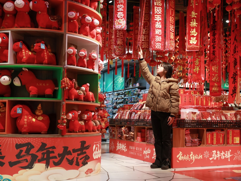 消费者纷纷来到集市,忙着选购各种新春饰品,以迎接新春佳节的到来。大红灯笼高高挂起,春联琳琅满目,还有各式各样的马年元素饰品,如马形挂饰、马年纪念币等,吸引了众多市民的目光。大家穿梭在摊位间,仔细挑选着心仪的饰品,脸上洋溢着节日的喜悦。