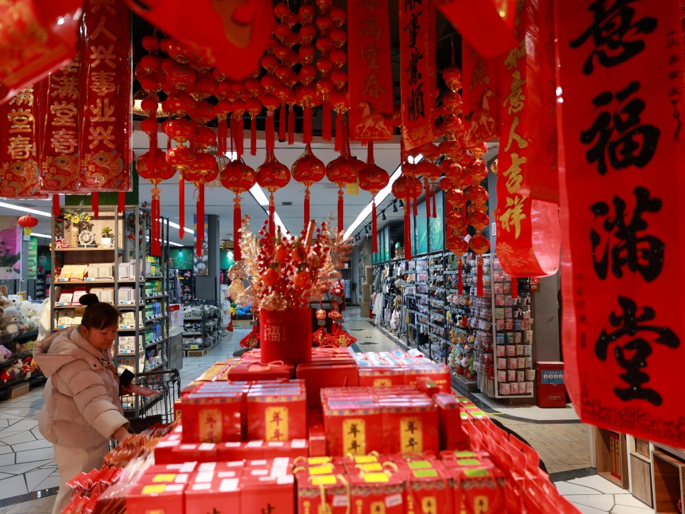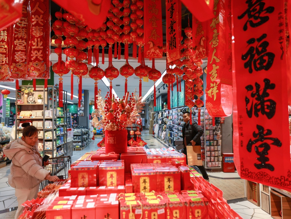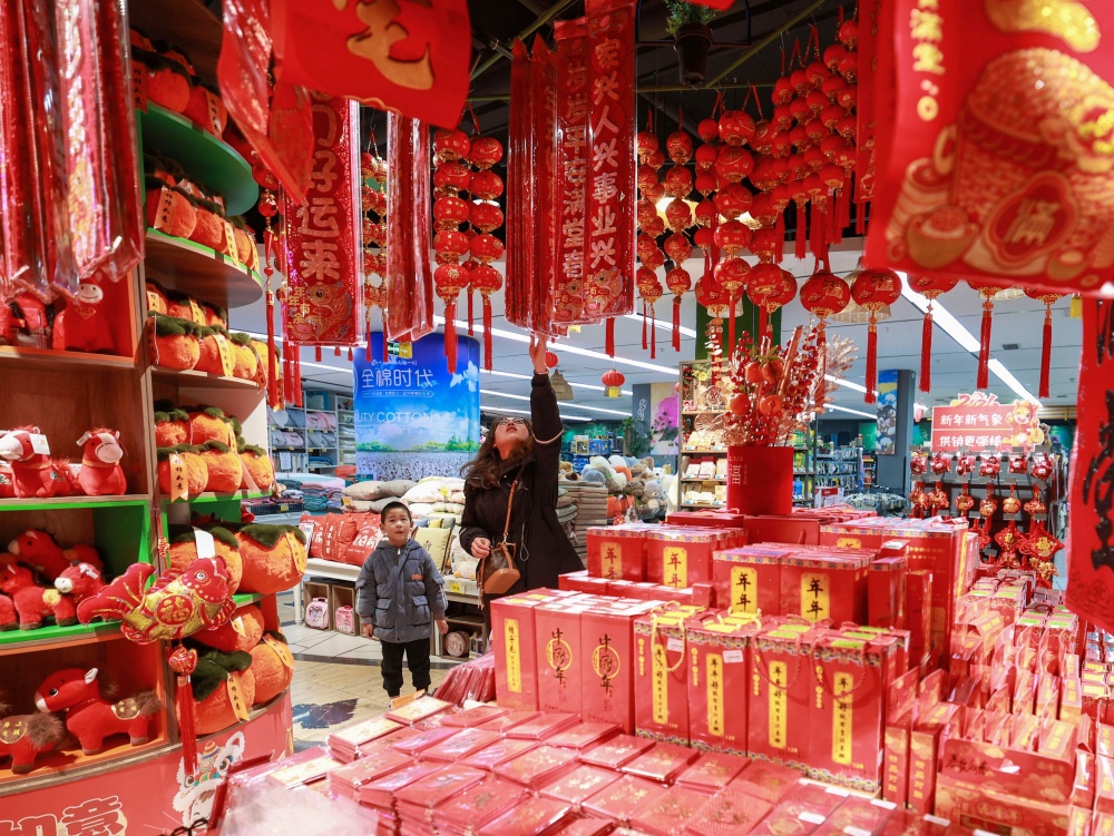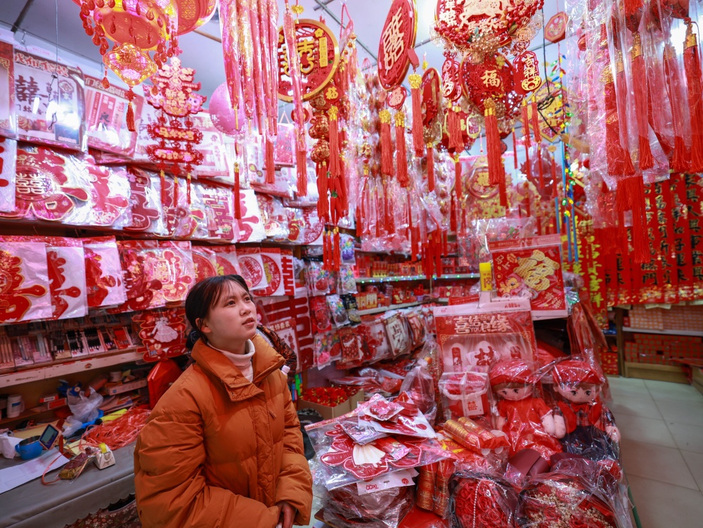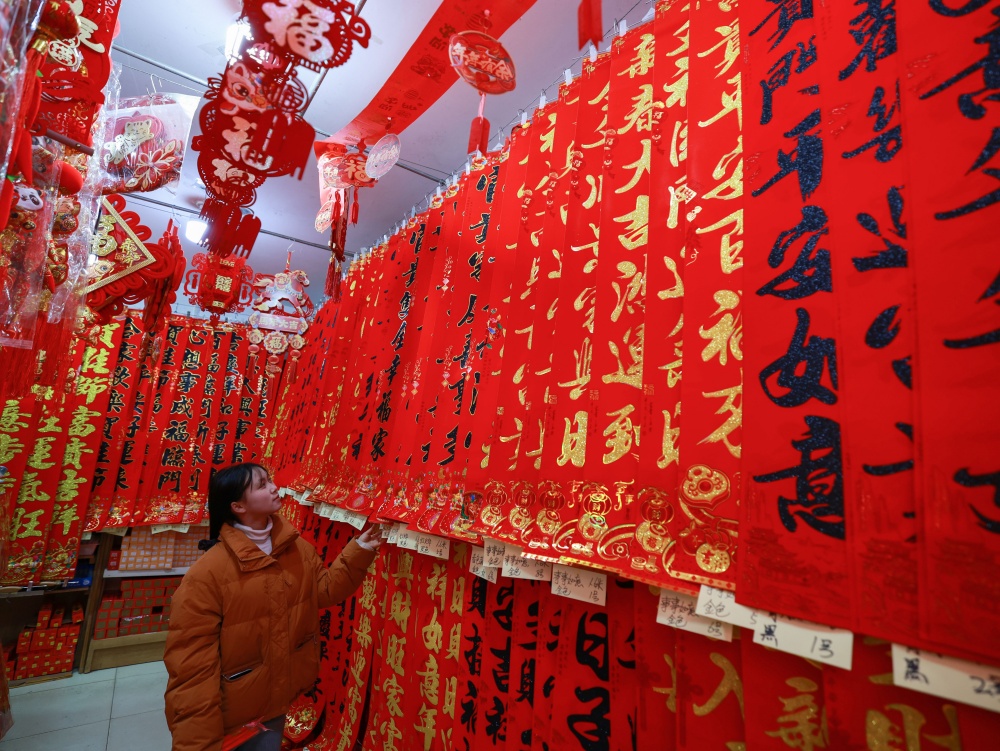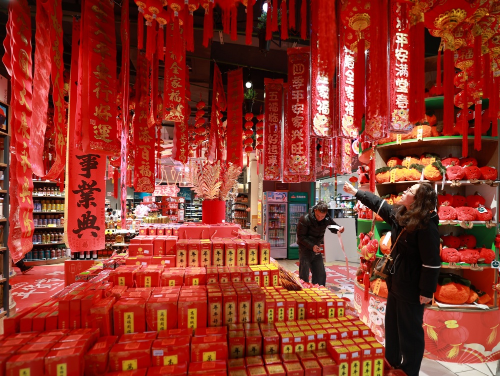 消费者纷纷来到集市,忙着选购各种新春饰品,以迎接新春佳节的到来。大红灯笼高高挂起,春联琳琅满目,还有各式各样的马年元素饰品,如马形挂饰、马年纪念币等,吸引了众多市民的目光。大家穿梭在摊位间,仔细挑选着心仪的饰品,脸上洋溢着节日的喜悦。
