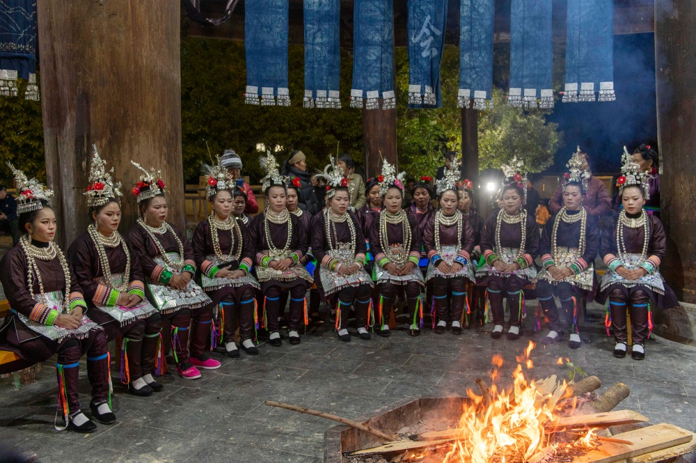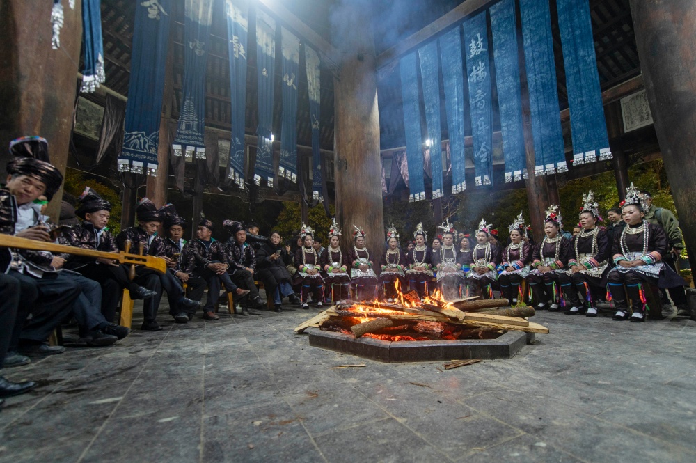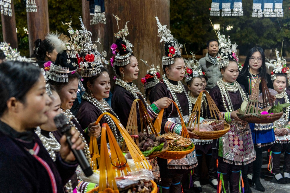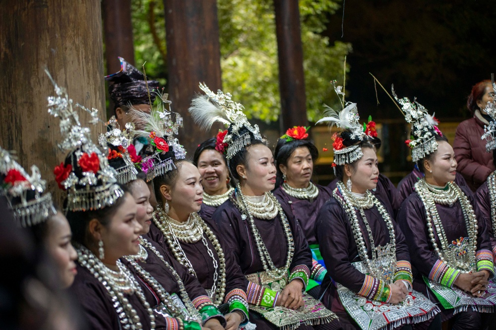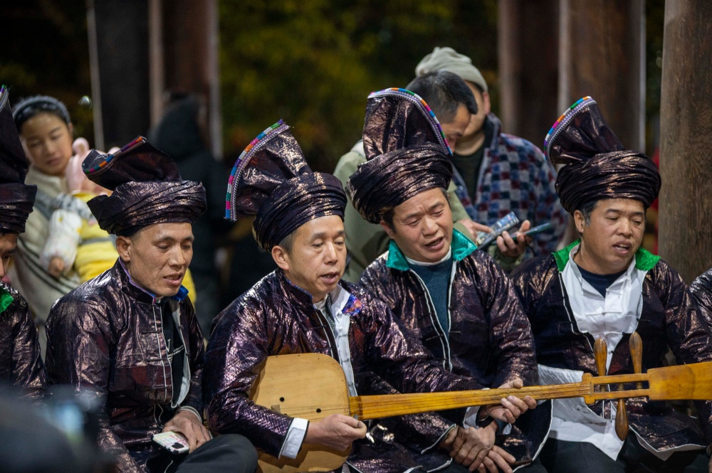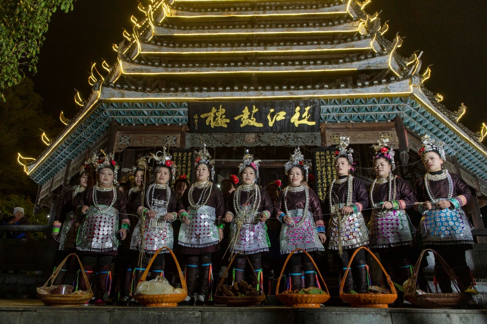 当日晚,贵州省黔东南苗族侗族自治州从江县在从江鼓楼内举行“鼓楼音乐会”迎新春活动。来自丙妹镇大榕村的侗族同胞与各地游客欢聚一堂,在多耶舞的欢快步伐与侗族大歌的清澈和声中,共迎新春佳节。