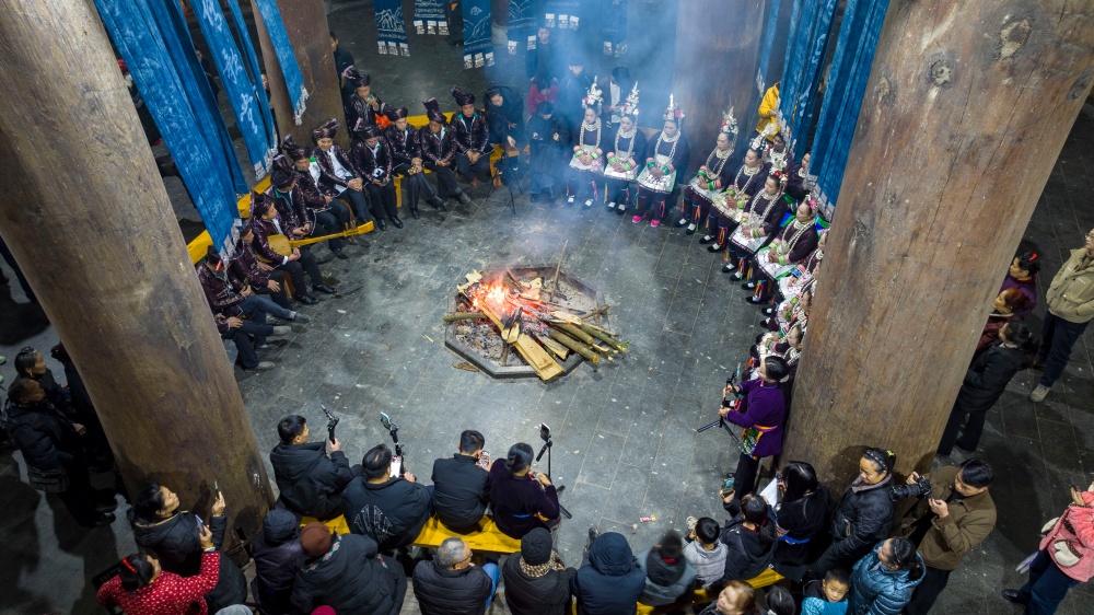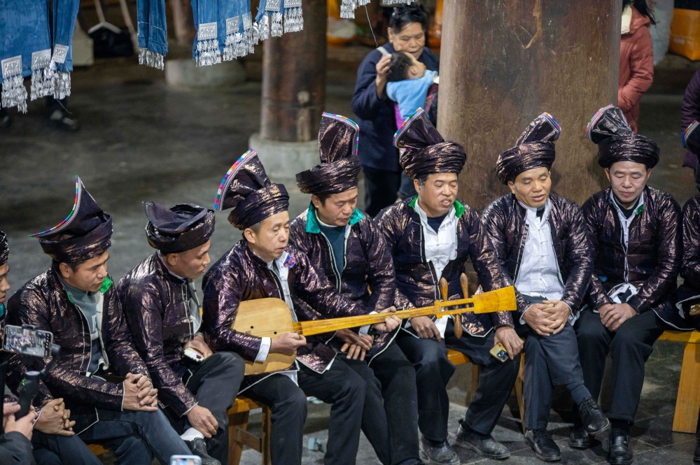 1月31日,来自贵州省从江县丙妹镇大榕村的侗族同胞与游客在鼓楼里跳多耶。
