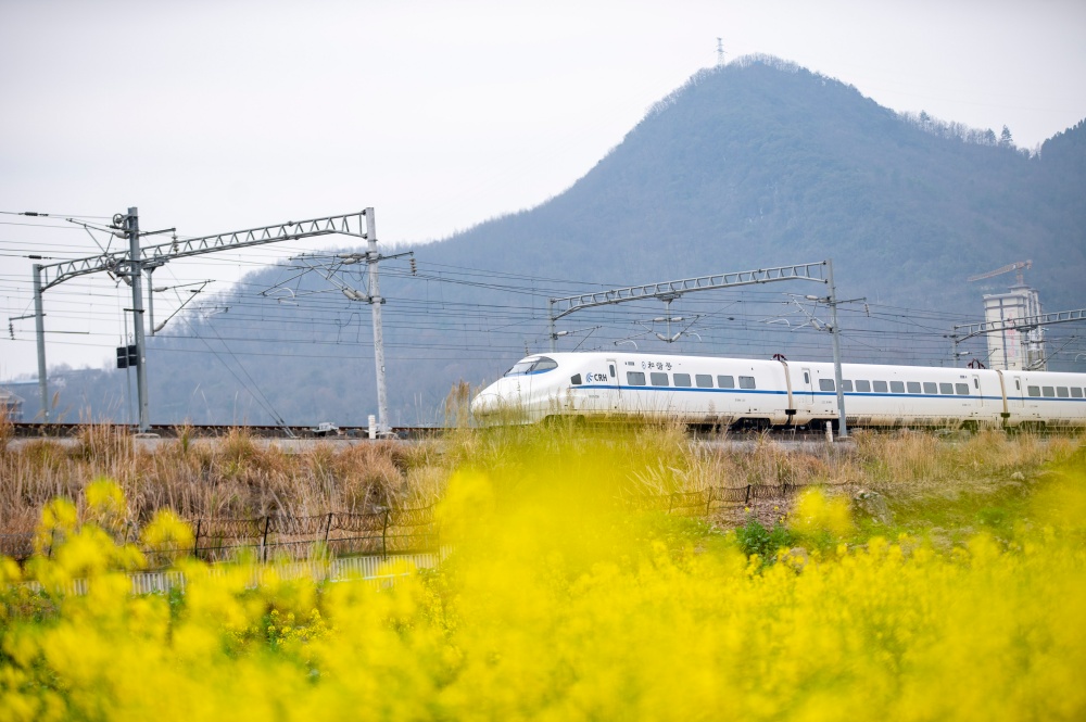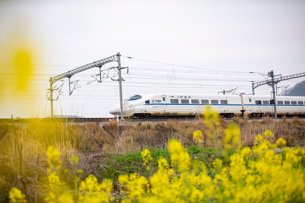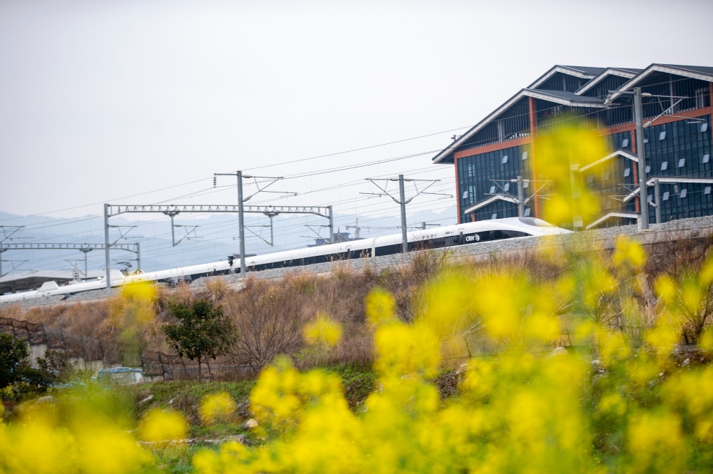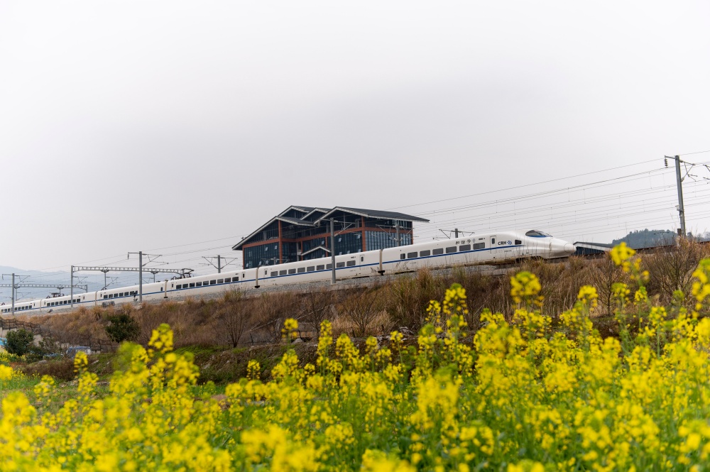 2月2日,一列动车组列车在贵广高铁贵州省从江县境内行驶。