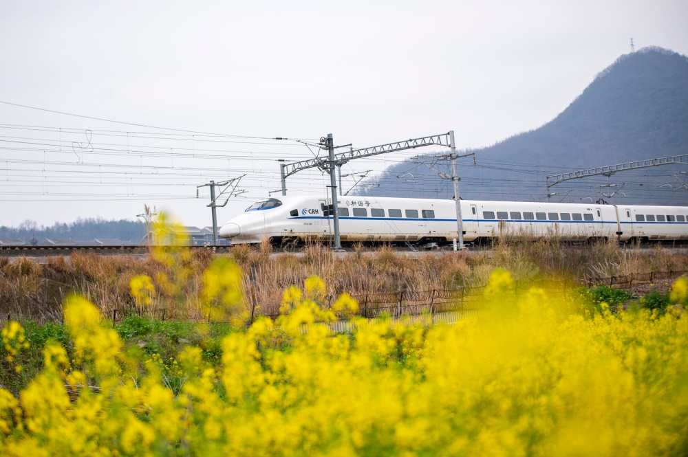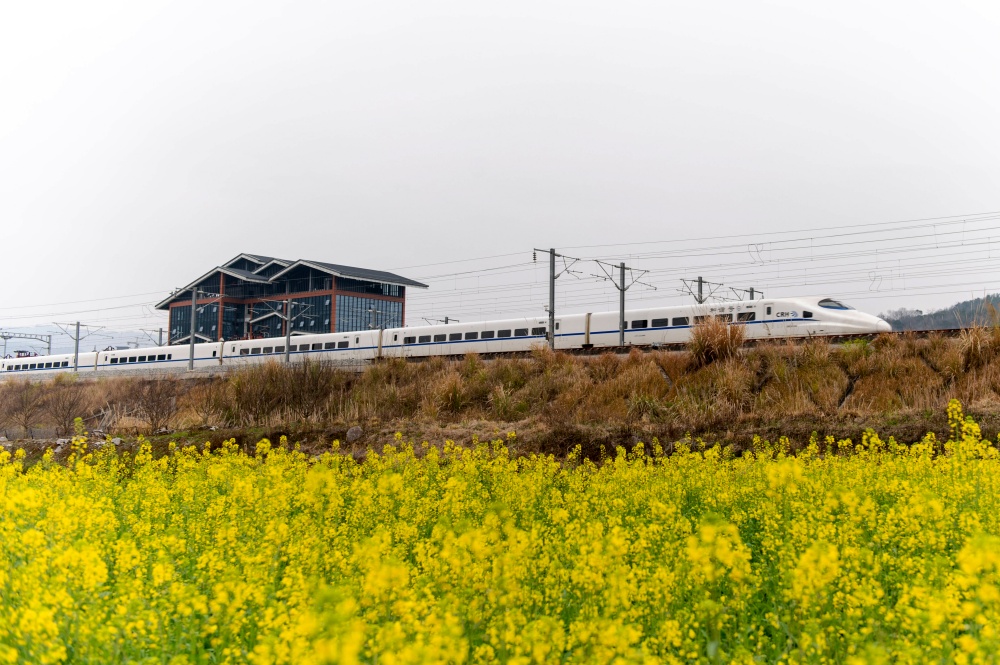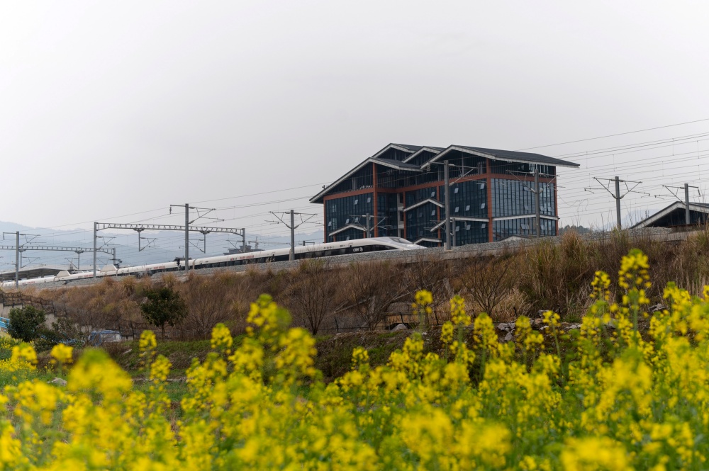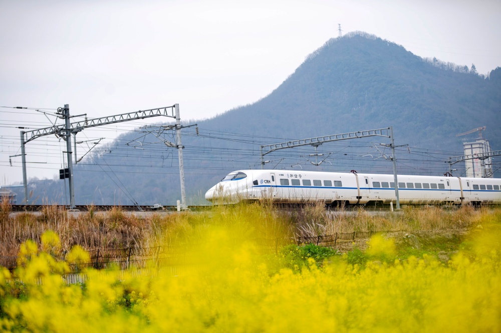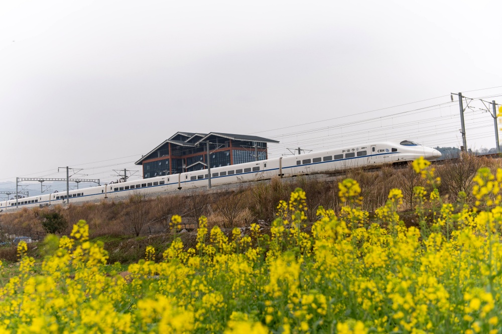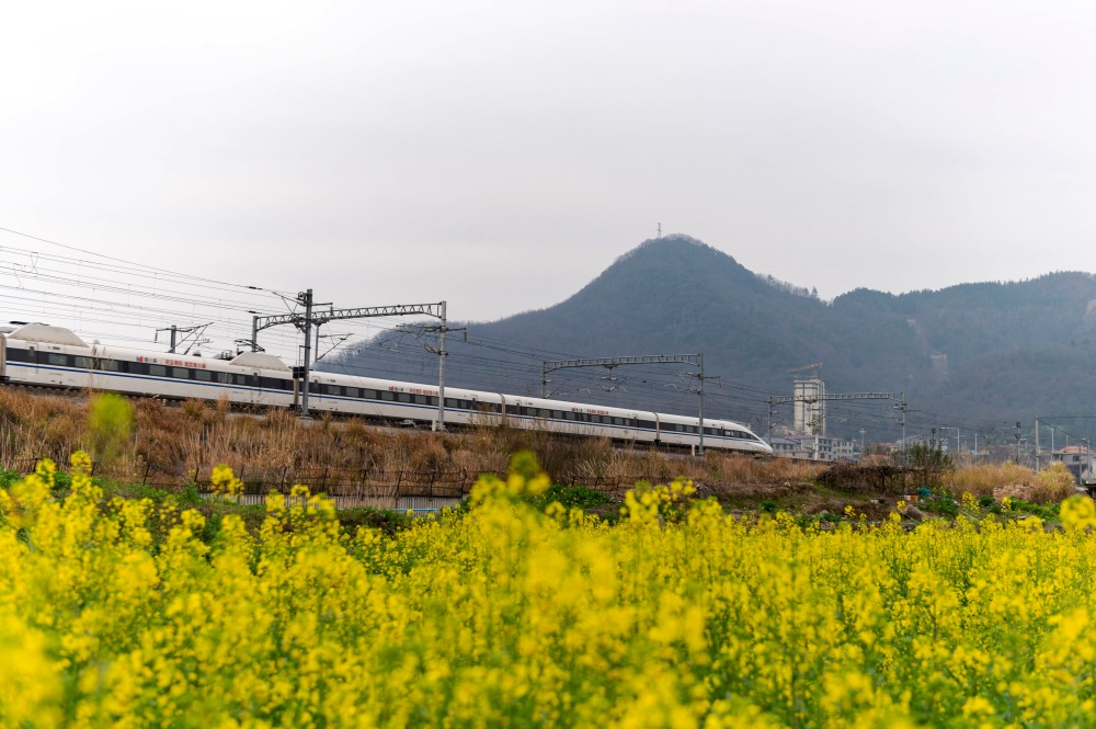立春临近,贵州省黔东南苗族侗族自治州从江县境内的油菜花竞相绽放,动车组列车穿行其间,构成一幅春日美丽画卷。